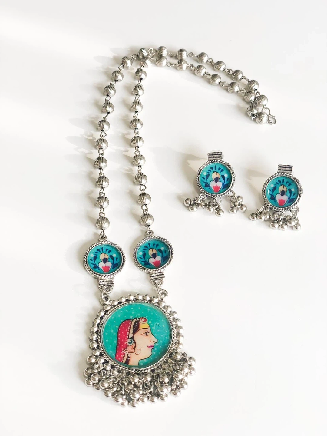 Here's a cute matching set of necklace and earrings! They feature a silver-tone finish and colourful artwork. Perfect for adding a pop of colour to any outfit.