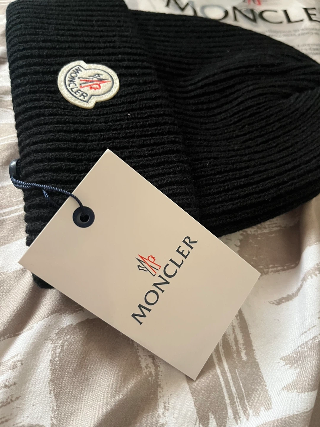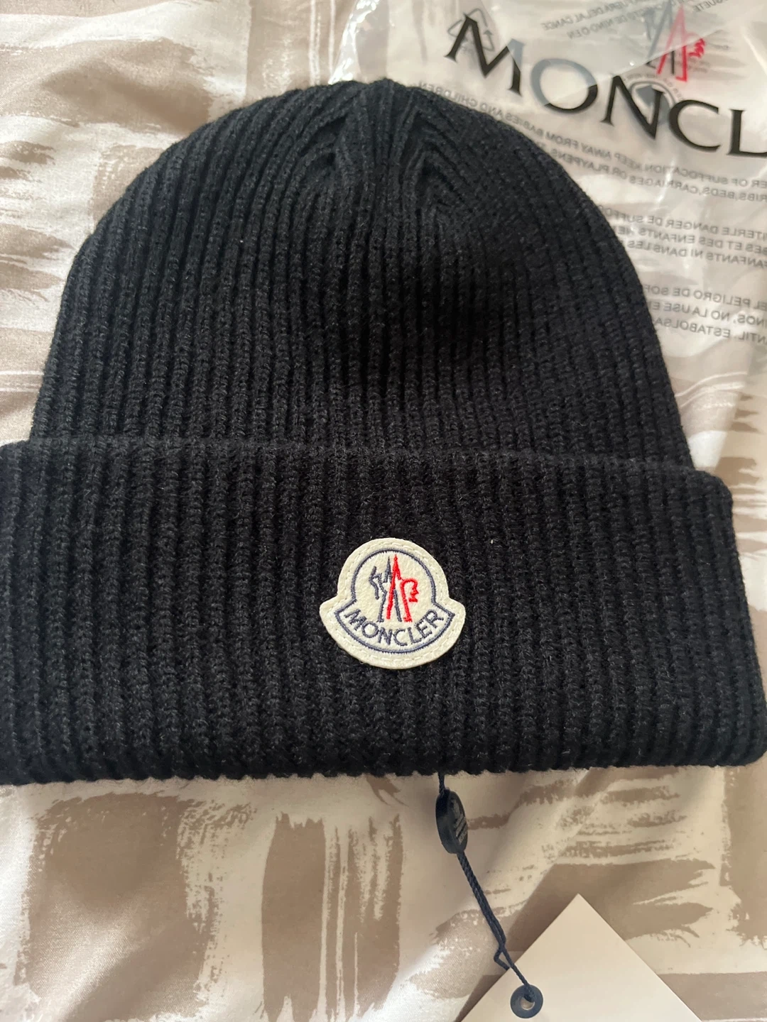 This is a black Moncler beanie hat. It's made from a ribbed knit material. The classic Moncler logo patch is on the front. It includes the original tag.