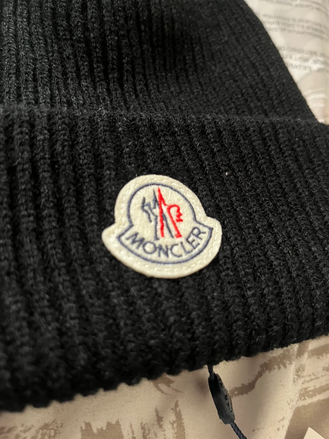 This is a black Moncler beanie hat. It's made from a ribbed knit material. The classic Moncler logo patch is on the front. It includes the original tag.