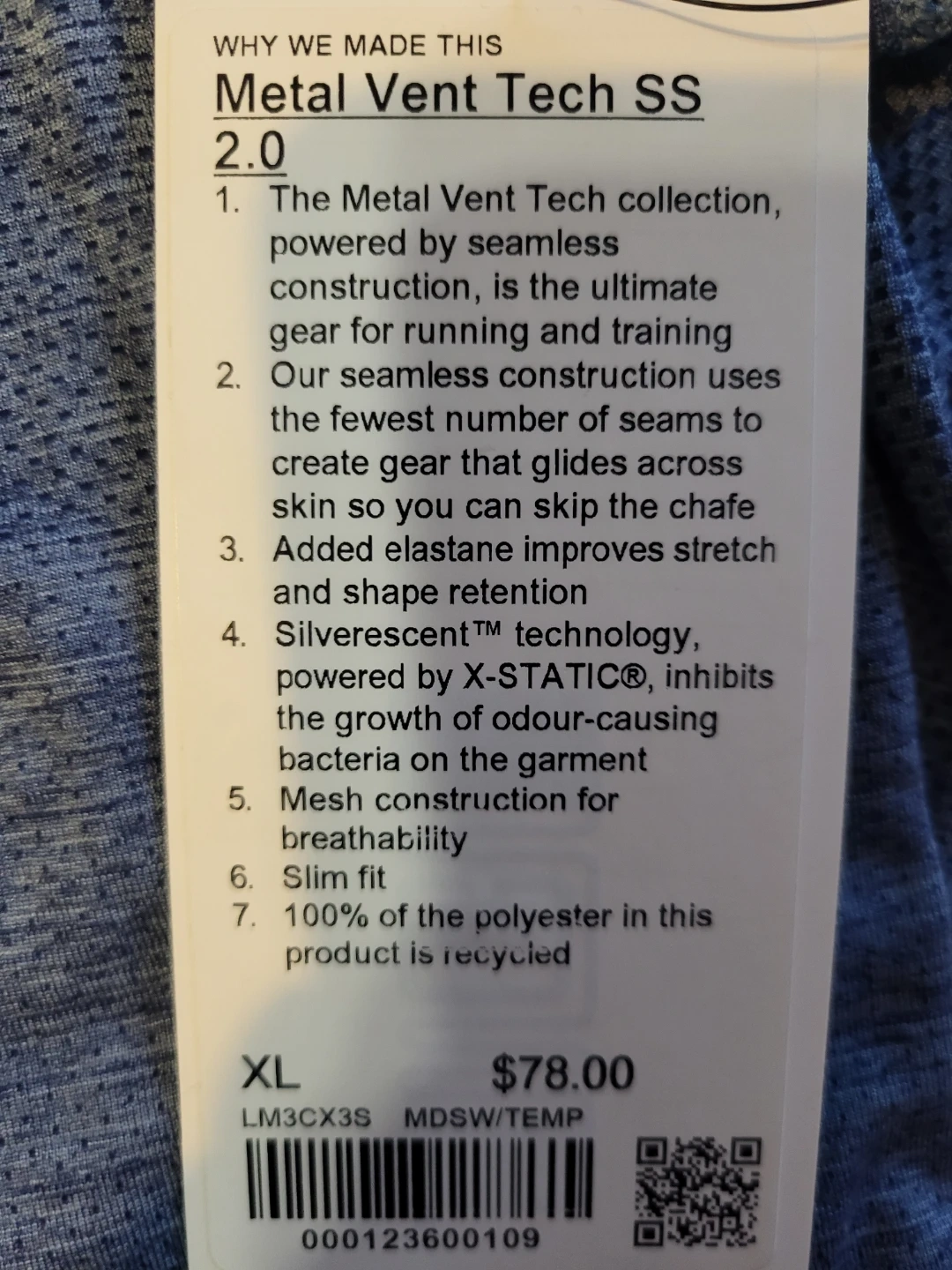 This Lululemon t-shirt is part of the Metal Vent Tech collection, designed for running and training. It's made with seamless construction and added elastane for stretch and shape retention. The fabric is 100% recycled polyester and features Silverescent technology to inhibit odour. Mesh construction provides breathability.