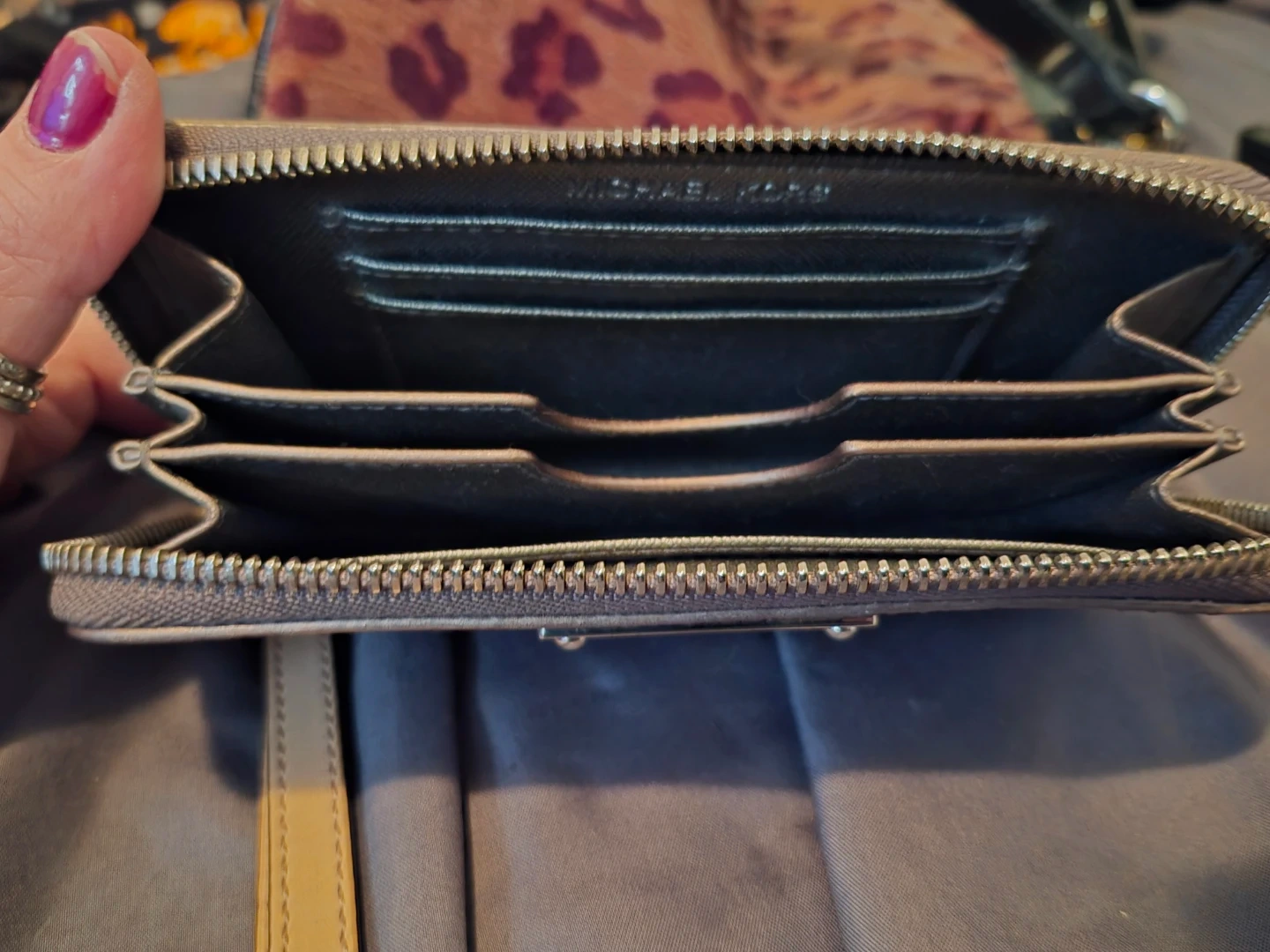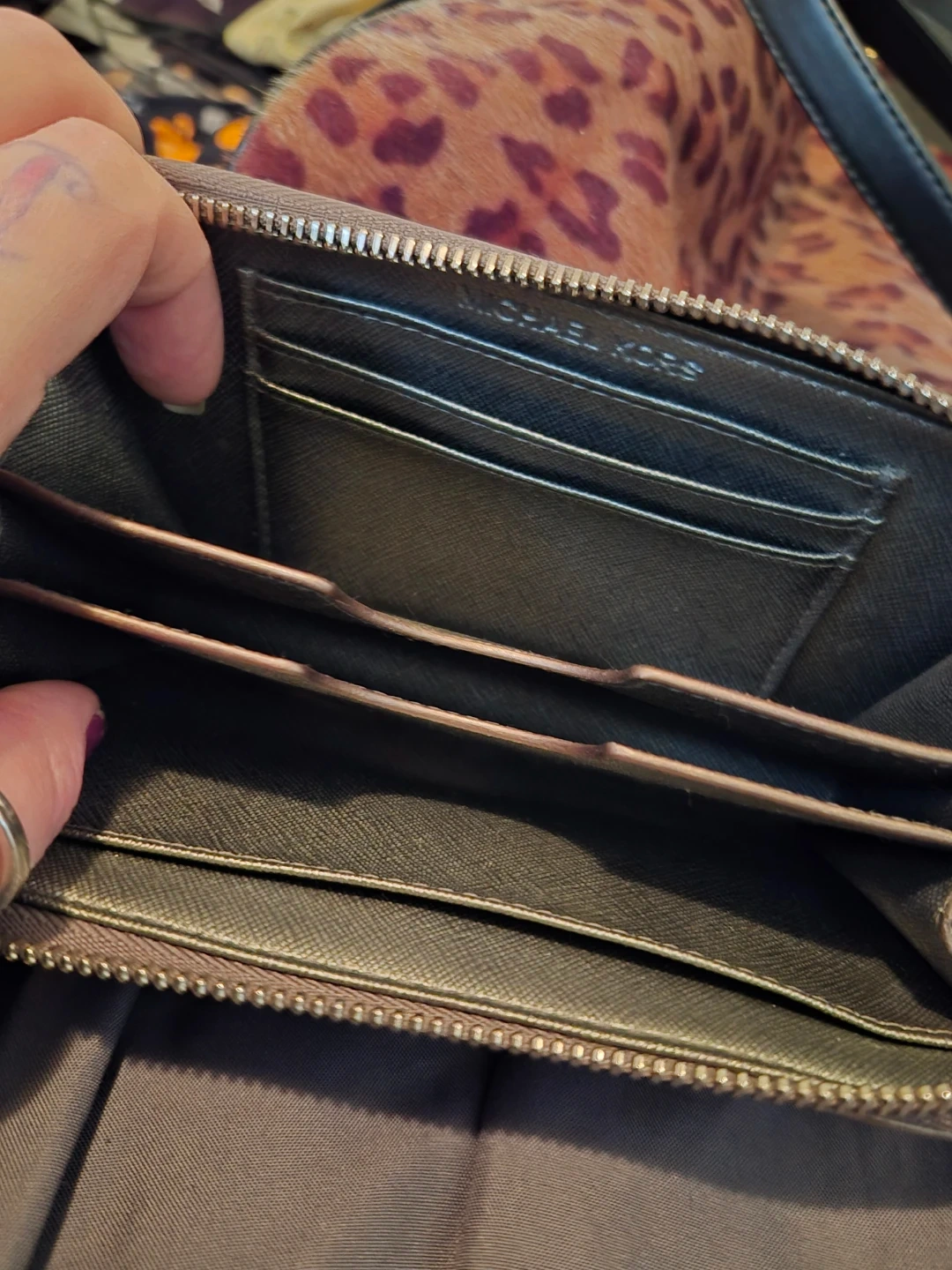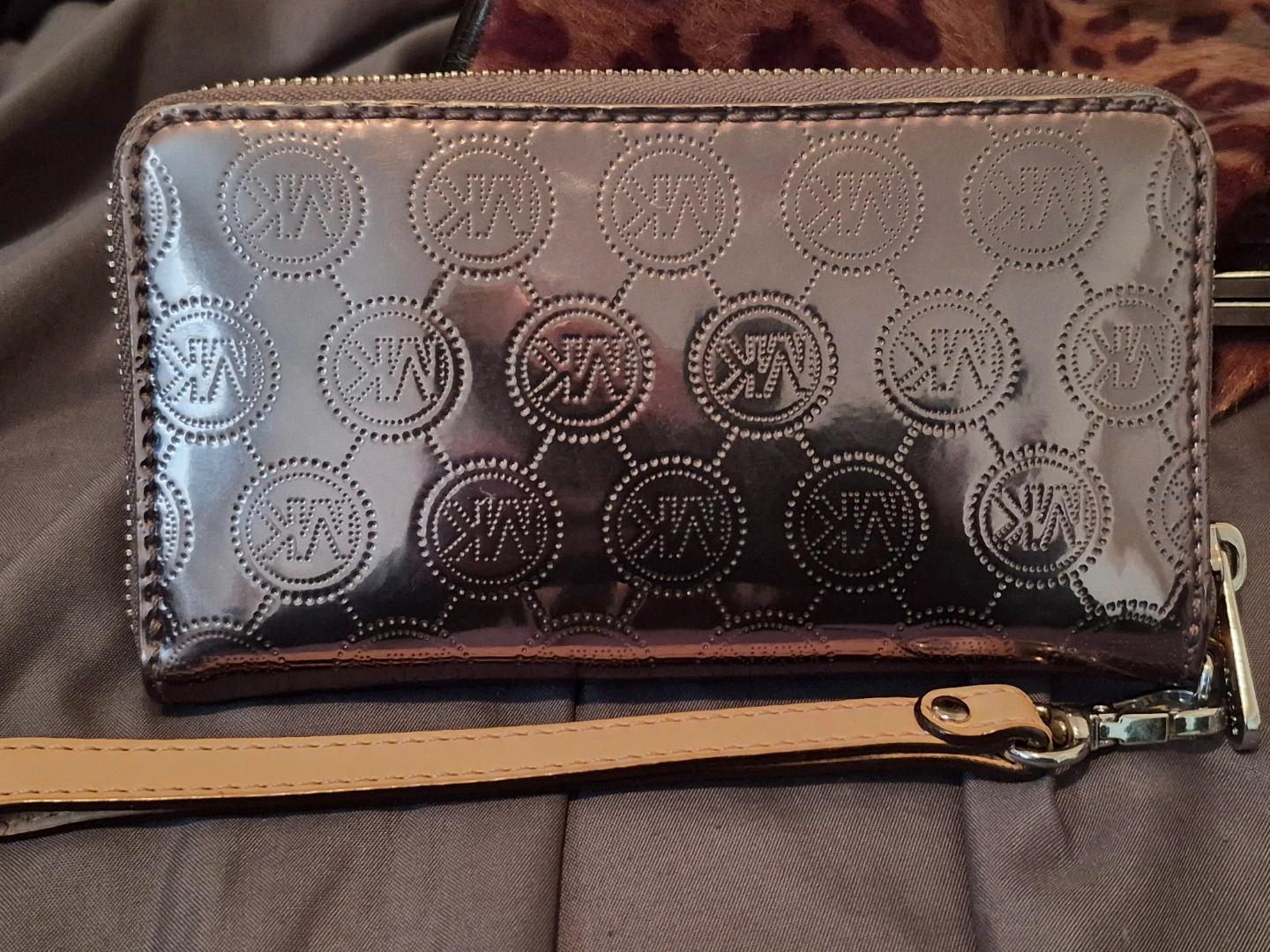 Shiny/reflective/metallic wallet in gold, with embossed MK logos. It's a zip-around style with a wrist strap. Plenty of card slots inside!