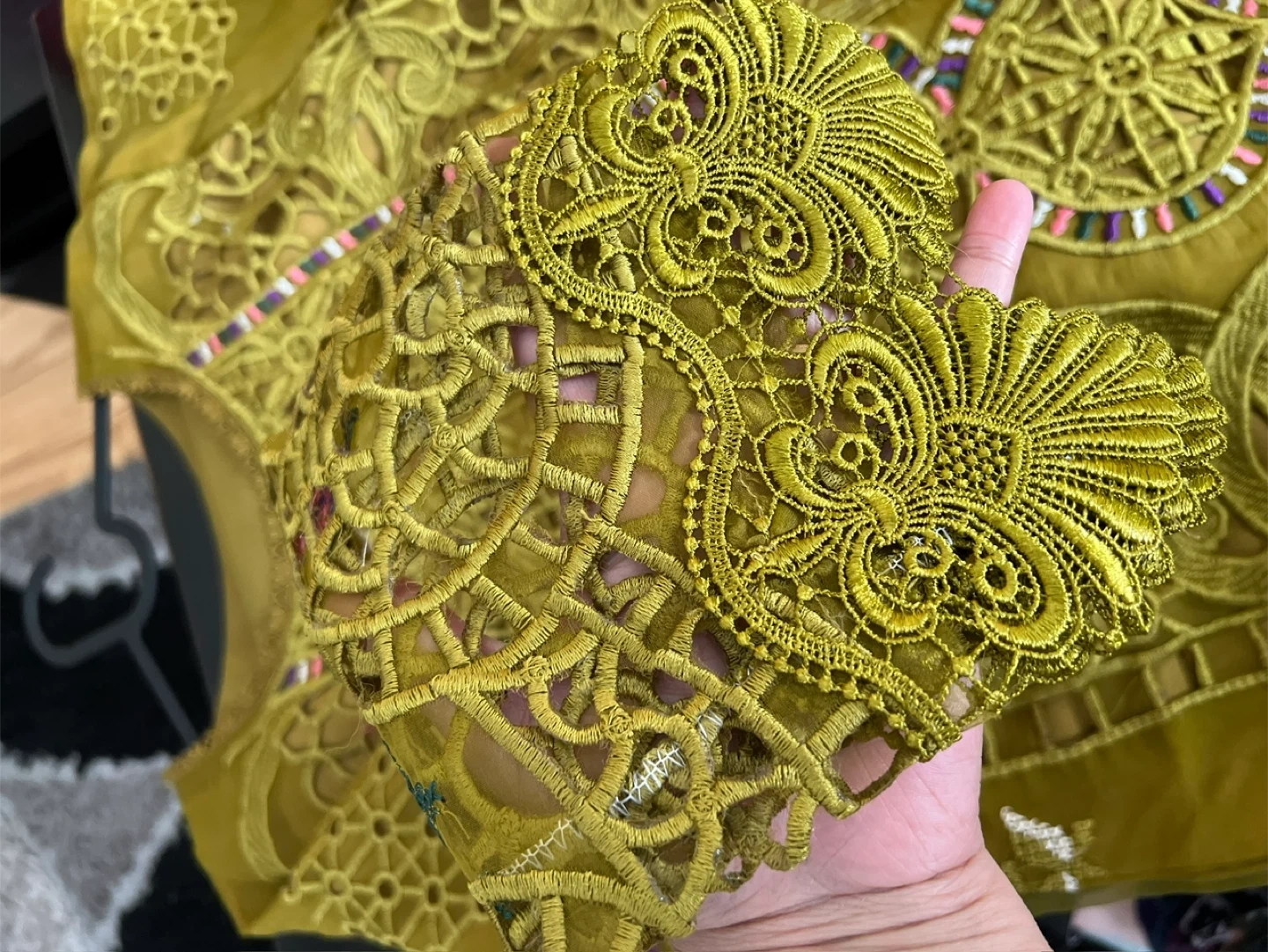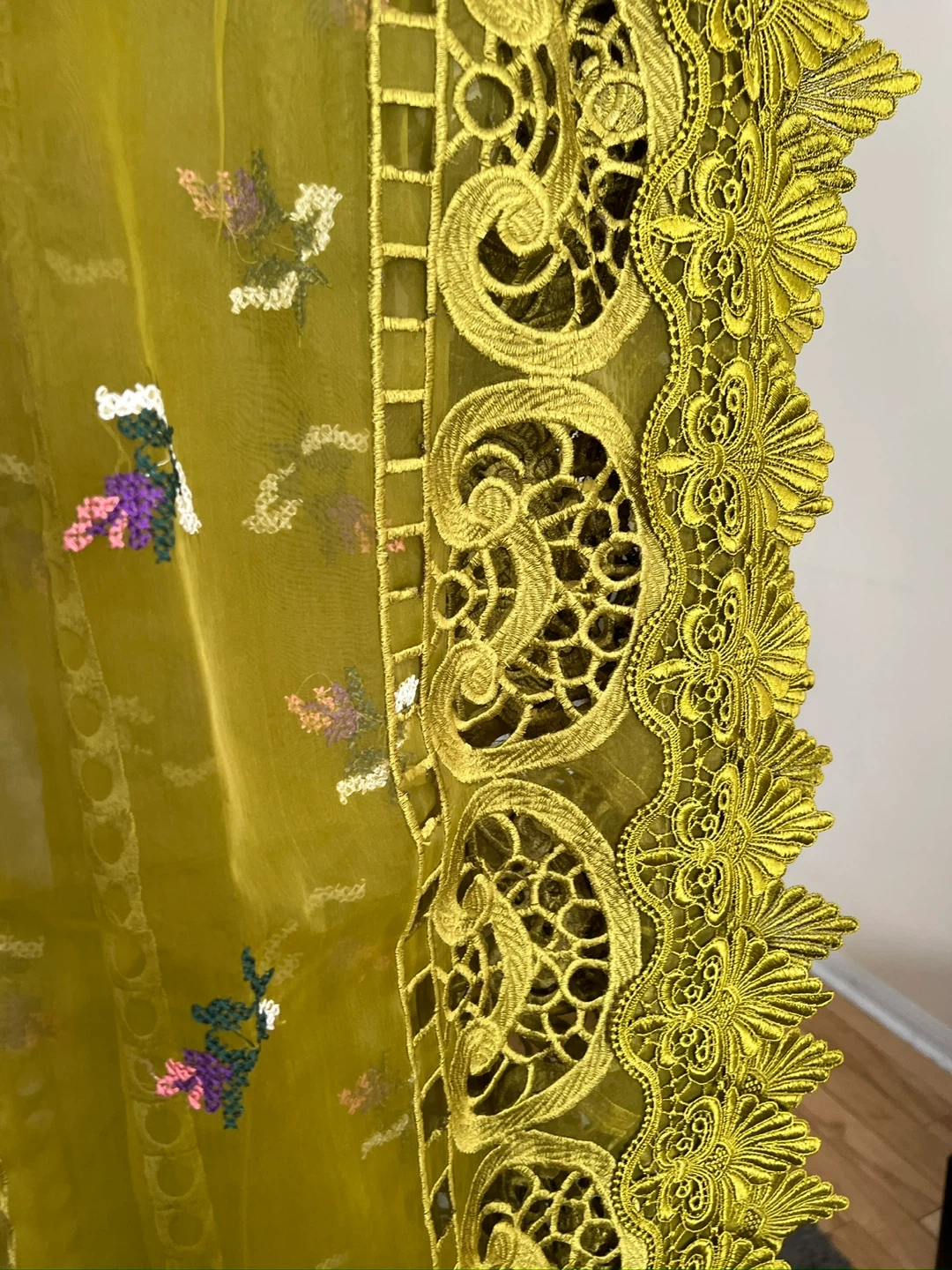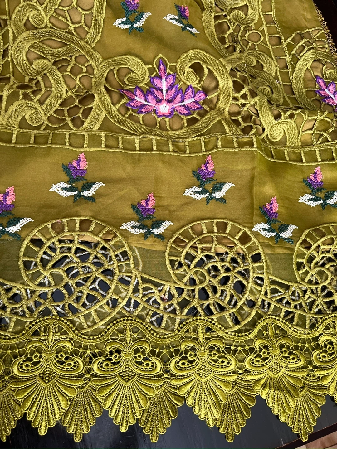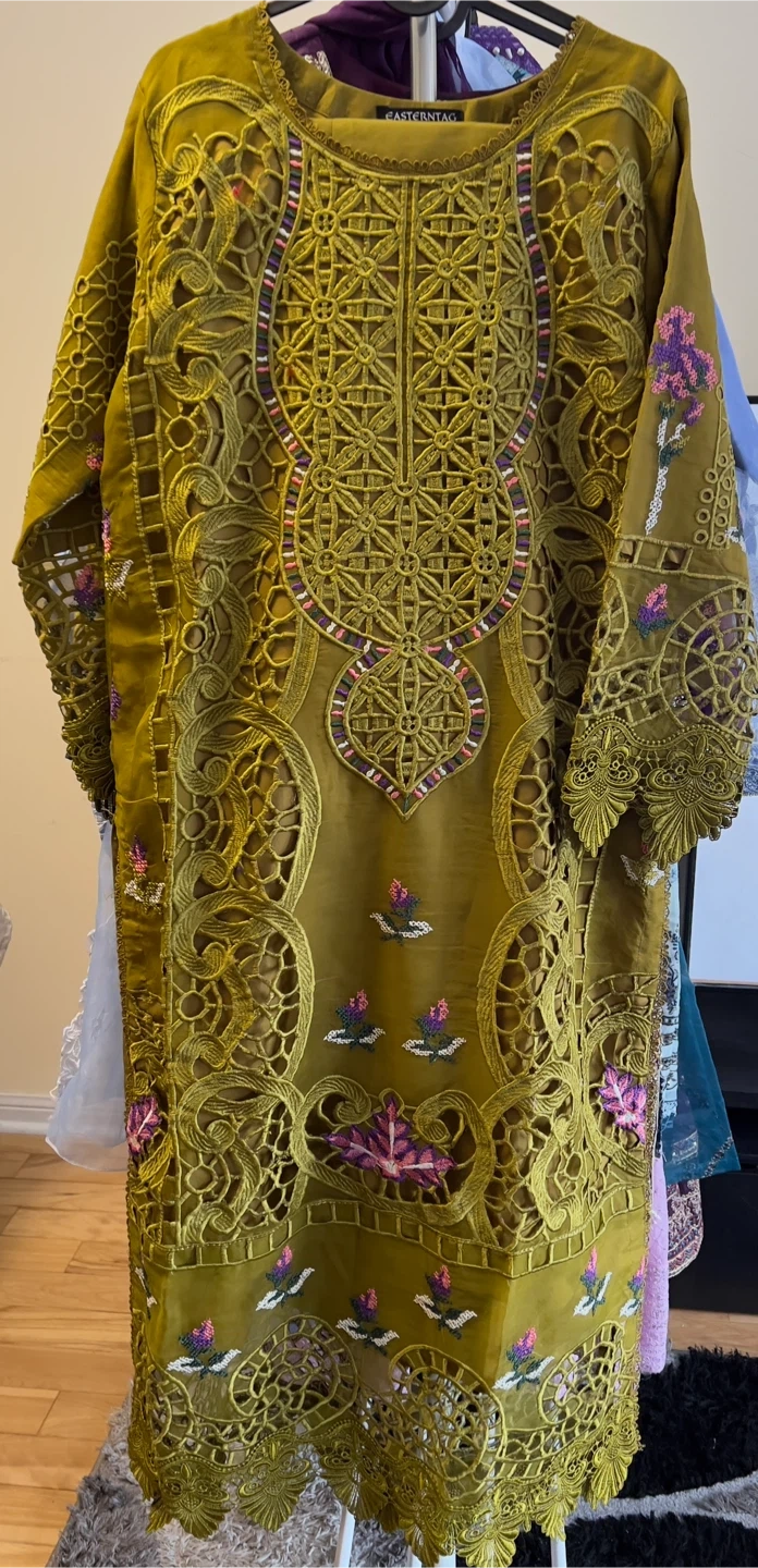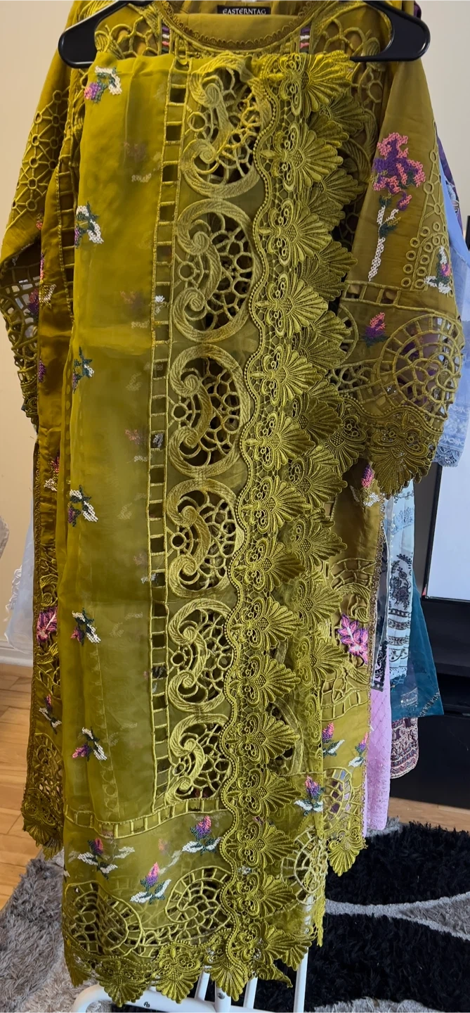 Maria B inspired beautiful Dhani color 3 pcs embroidered and cutwork suit with a beautiful cutwork embroidered dupatta. Size: Medium. Price: $135. Pickup/Delivery available.