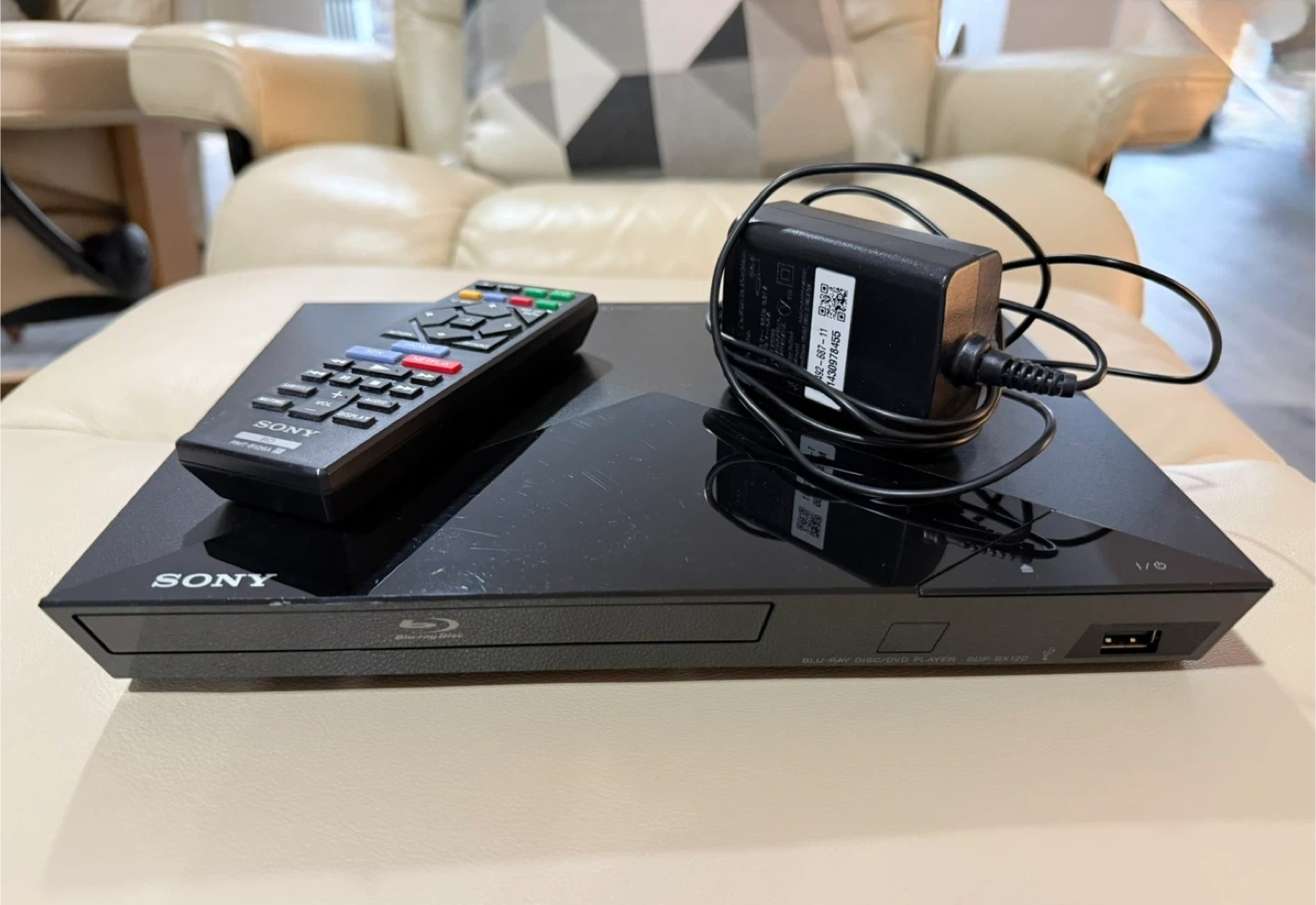 Sony Blu-ray Disc DVD Player, model BDP-BX120. It includes the player, a remote control, and a power adapter.