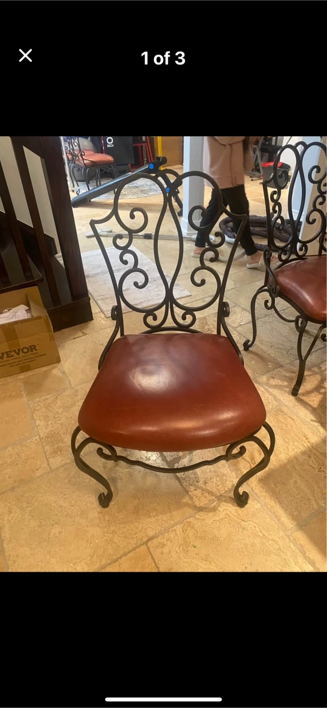 Charming set of four wrought iron dining chairs. Each chair features a padded seat upholstered in a rich, reddish-brown leather. The intricate scrollwork on the iron frames adds an elegant touch. These chairs would be a lovely addition to any dining space!