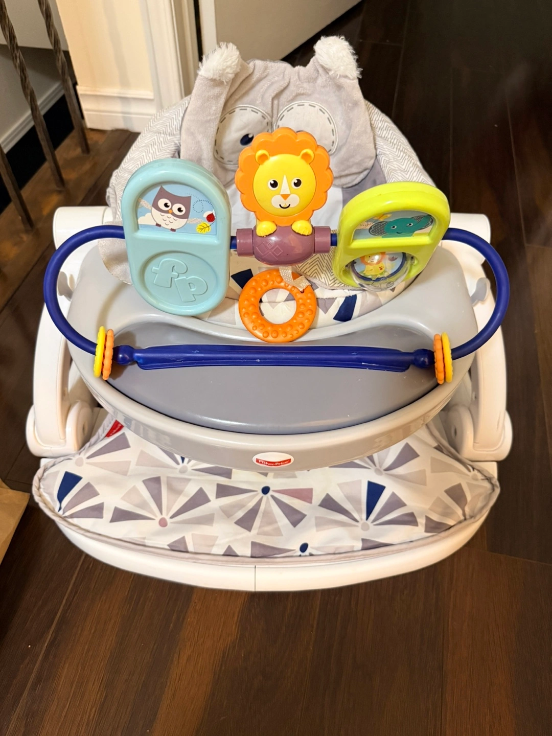 Fisher-Price Sit-Me-Up Floor Seat with multiple fun toys attached. Includes a snack tray for convenience. The plush sloth washable pad offers comfort for your little one.