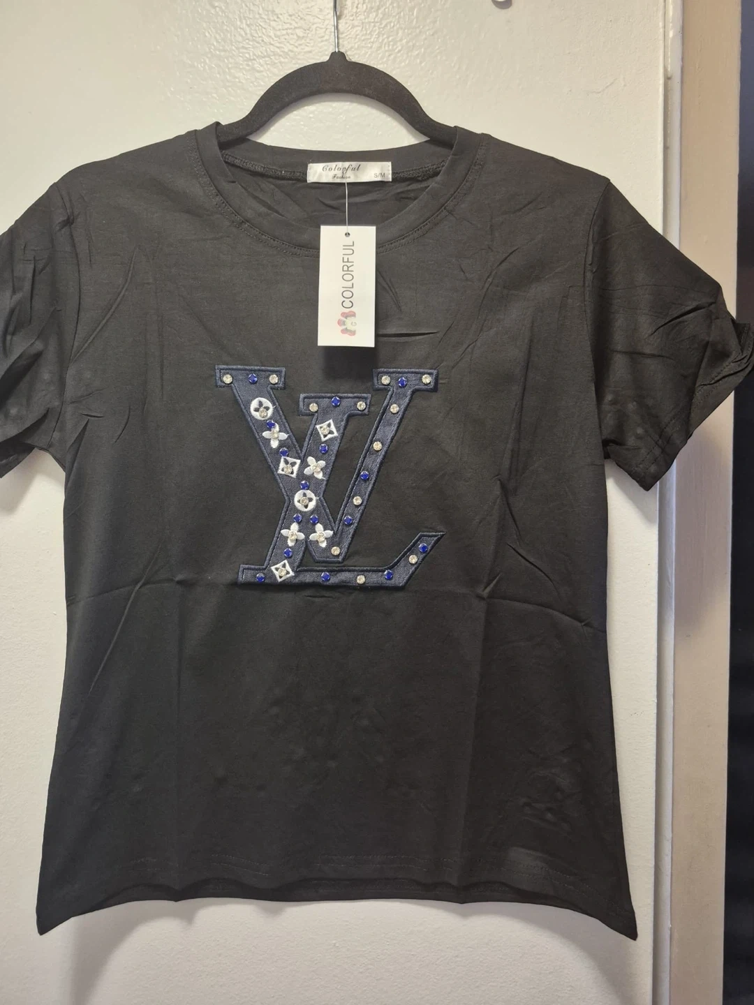 This black t-shirt from "Colorful" features a bold, embellished 'LV' logo on the front. The logo is detailed with denim-like texture, blue rhinestones, and white floral accents. It's a size S/M. This top adds a stylish statement to any casual outfit!