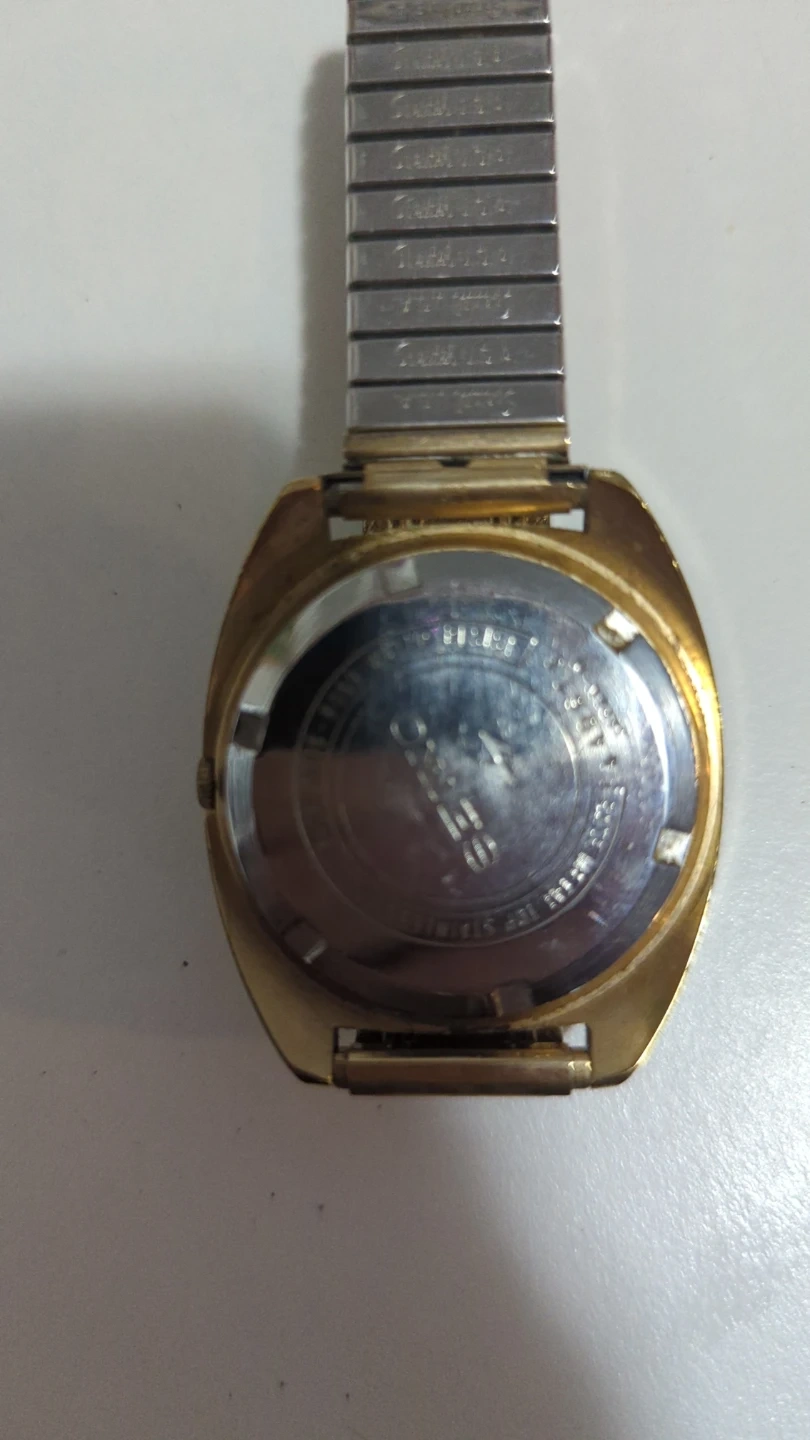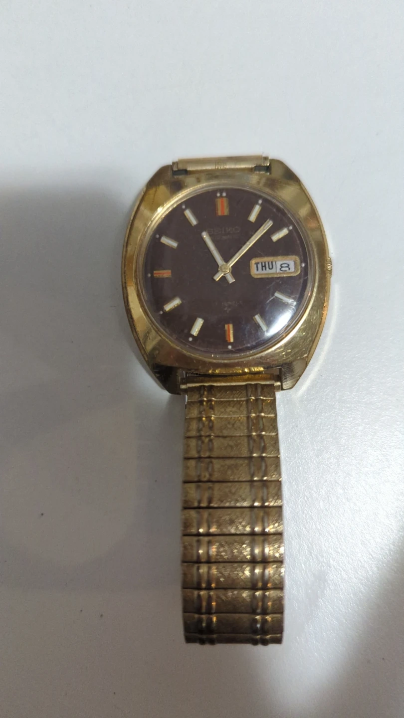 Gold-tone automatic Seiko watch with a brown dial. It shows the day and date. Metal expansion band.