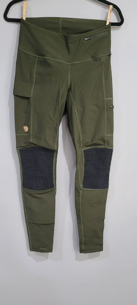 Green Fjällräven leggings with reinforced knee and butt patches. These leggings feature multiple pockets for convenience. Perfect for hiking or outdoor activities!