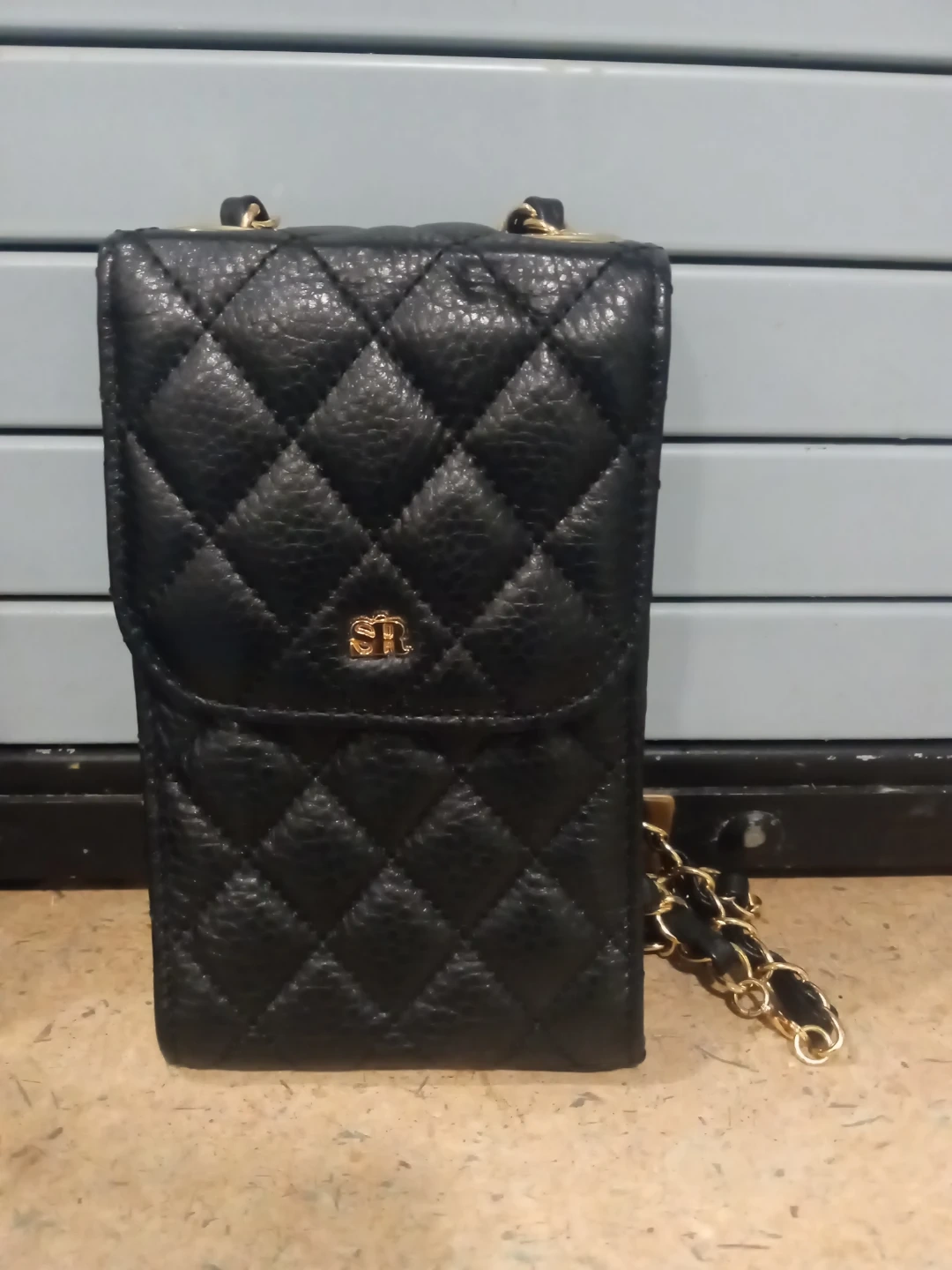 Stylish black quilted phone bag with a faux leather finish. It features a secure snap closure and a gold chain strap for easy carrying. Perfect for keeping your essentials close!