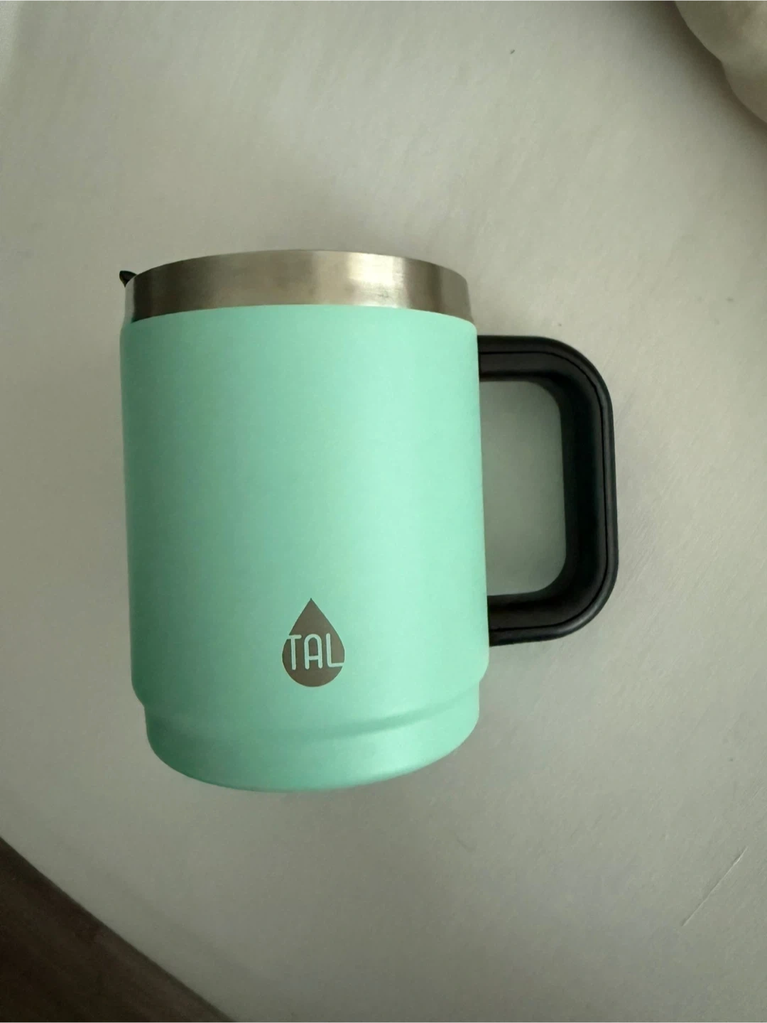 Keep your drinks hot or cold with this TAL double wall insulated mug! It's a lovely mint colour and features a convenient handle. Perfect for coffee, tea, or any beverage you enjoy