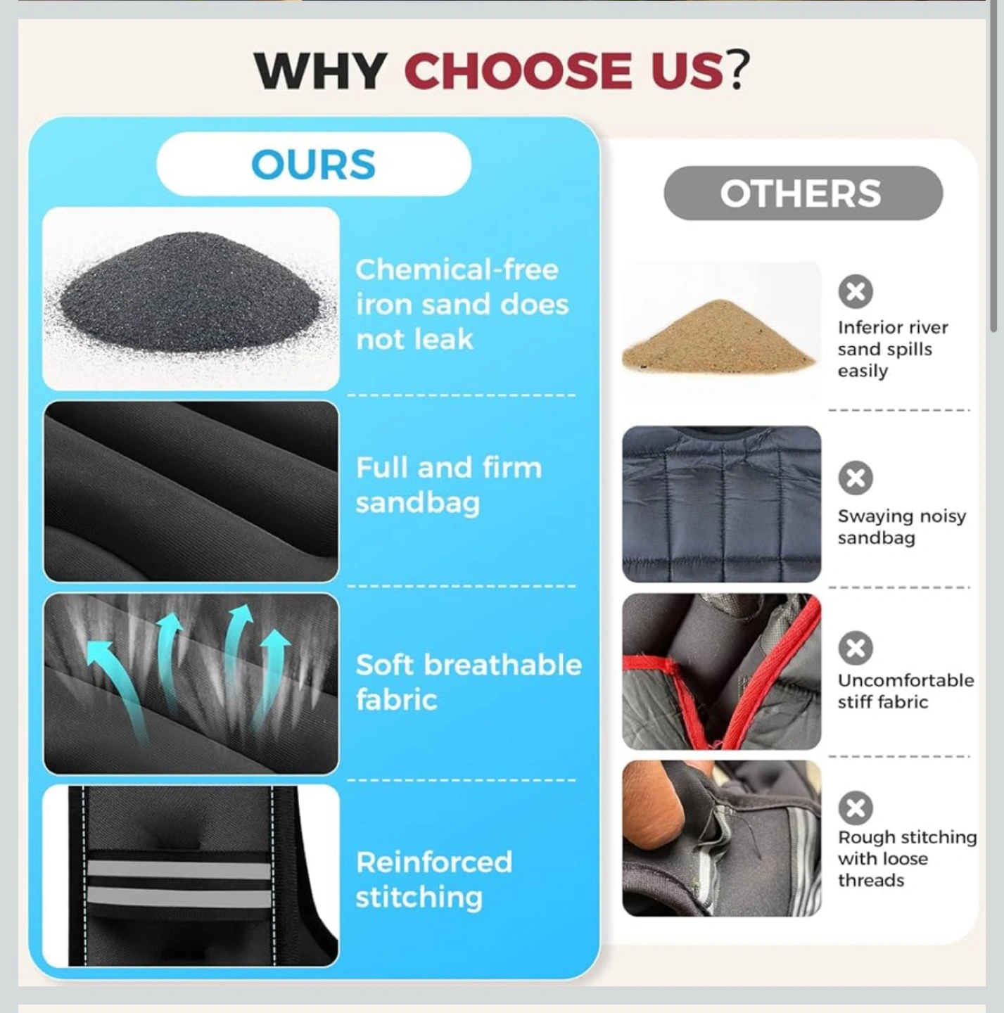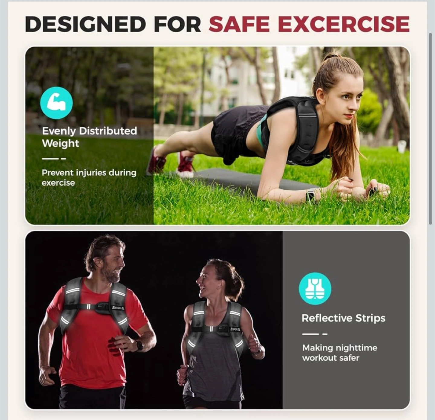 Designed for safe exercise, this vest evenly distributes weight to prevent injuries. Plus, the reflective strips make nighttime workouts safer. It's black and weighs 10lbs, perfect for walking, weight loss, training, and running