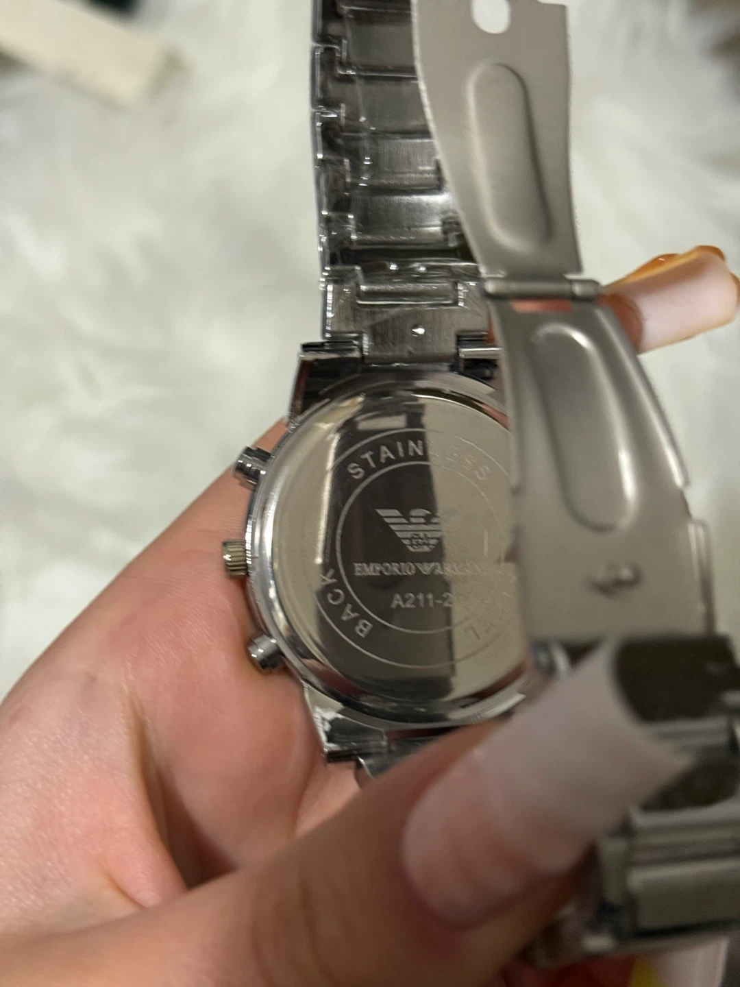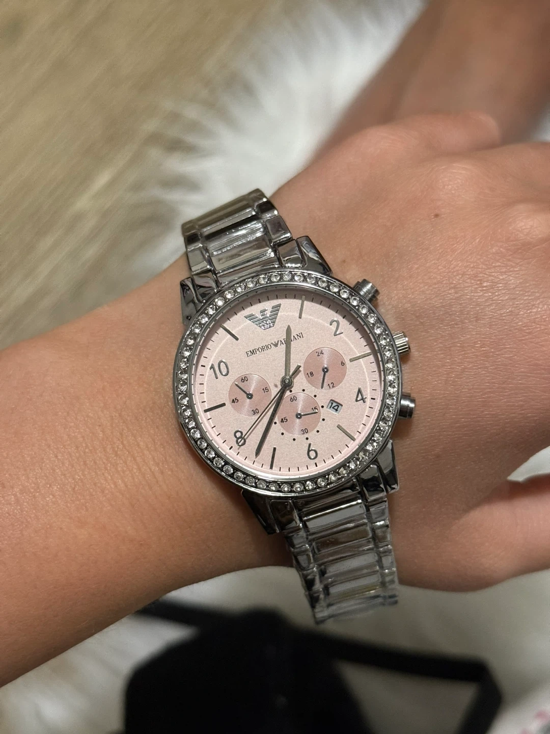 Selling a beautiful Emporio Armani ladies' watch. It has a lovely pink face and a stainless steel band. The watch is in great condition and ready for a new owner!