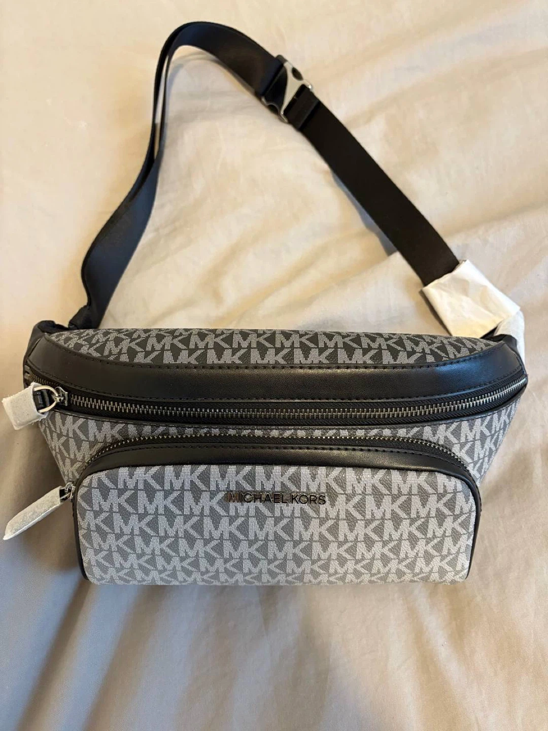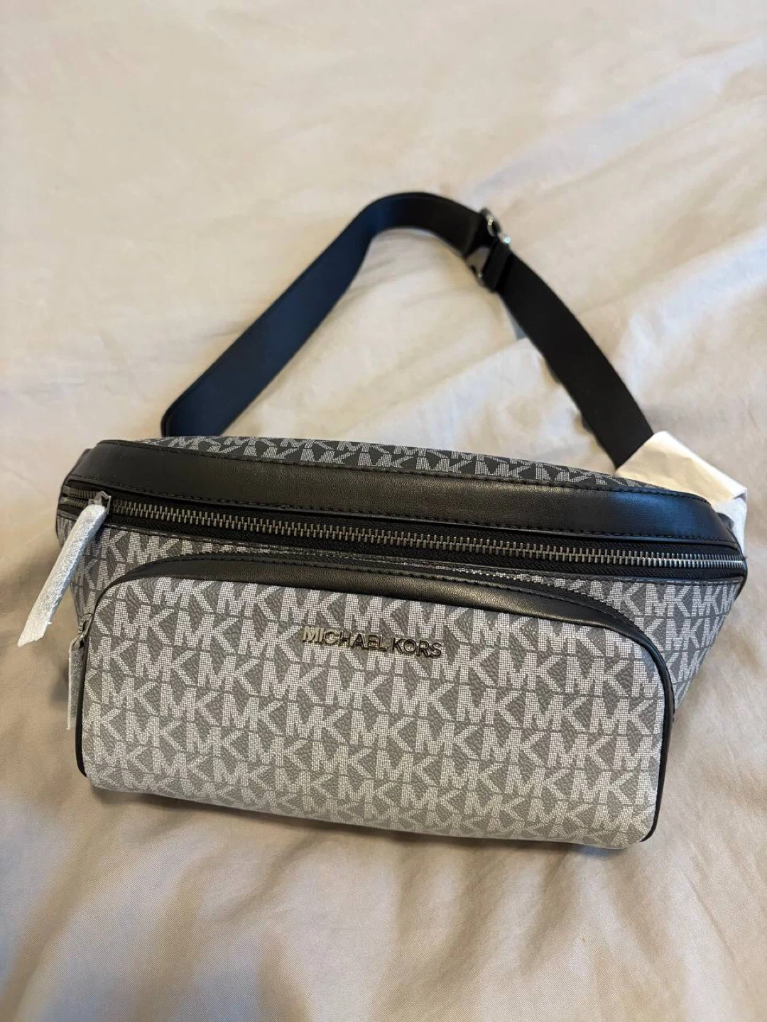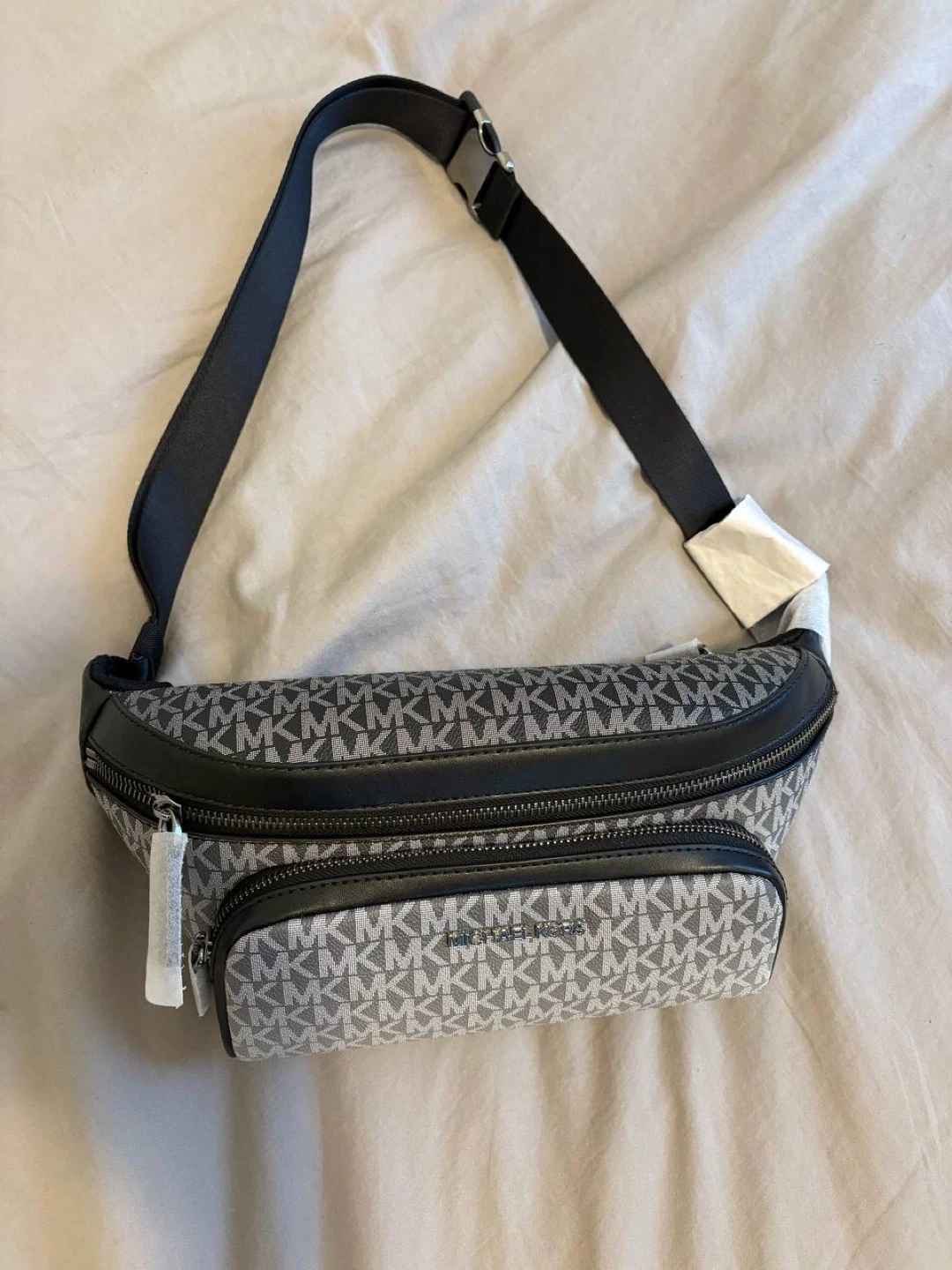 32Selling a new with tags Michael Kors belt bag. It features the classic MK logo pattern in grey and white, with black trim and an adjustable strap. Perfect for keeping your essentials close.