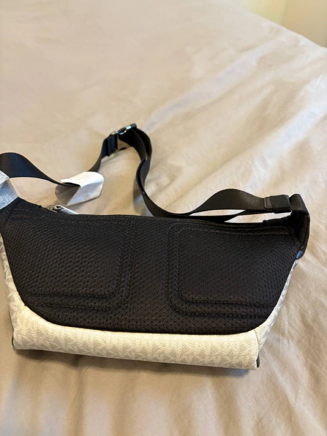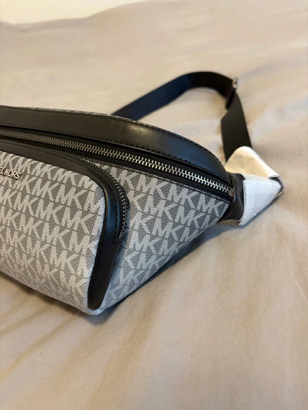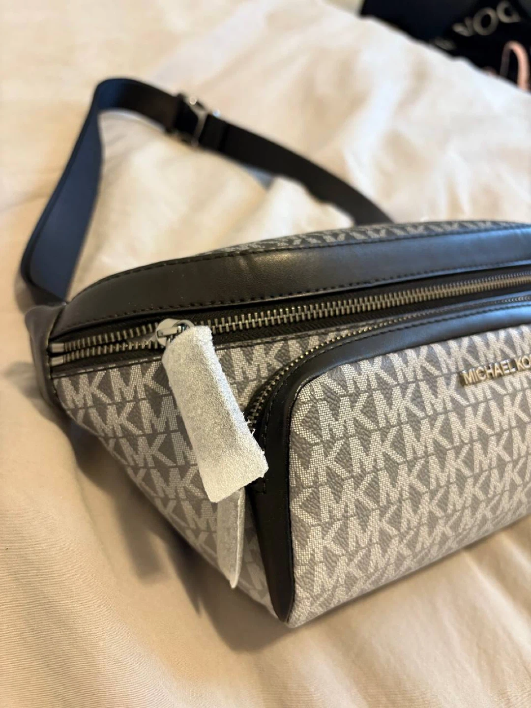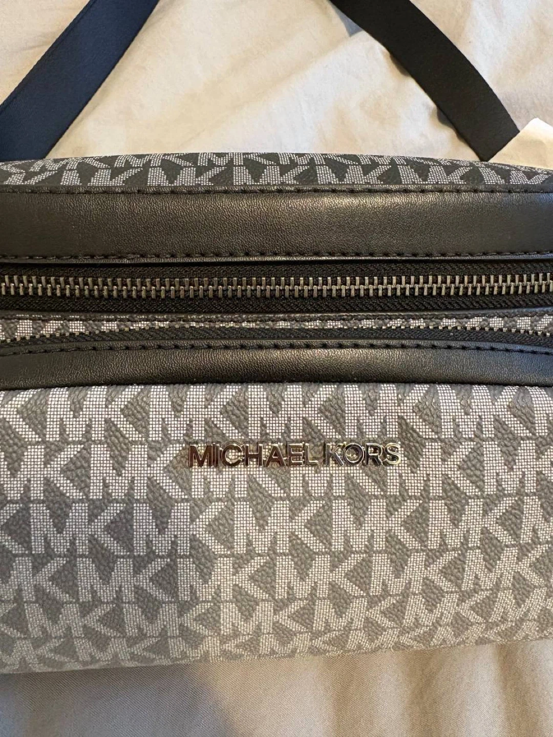 32Selling a new with tags Michael Kors belt bag. It features the classic MK logo pattern in grey and white, with black trim and an adjustable strap. Perfect for keeping your essentials close.