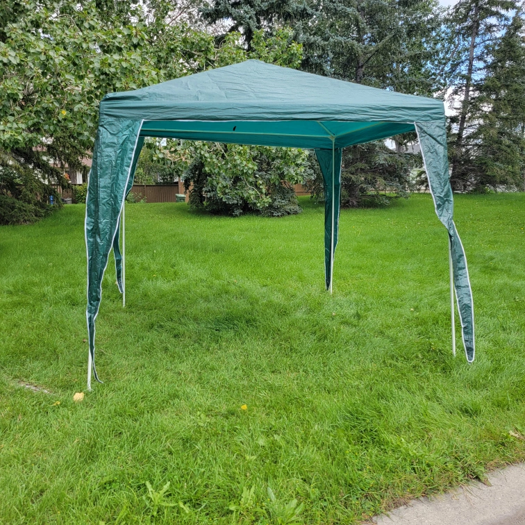 Victory Garden Sunshade, perfect for outdoor activities like picnics and barbecues! It's easy to assemble with a durable polyurethane fabric and a powder-coated frame. Base perimeter: 9 x 9 ft. Périmètre au sol: 2,7 x 2,7 m. Originally bought for $49.99