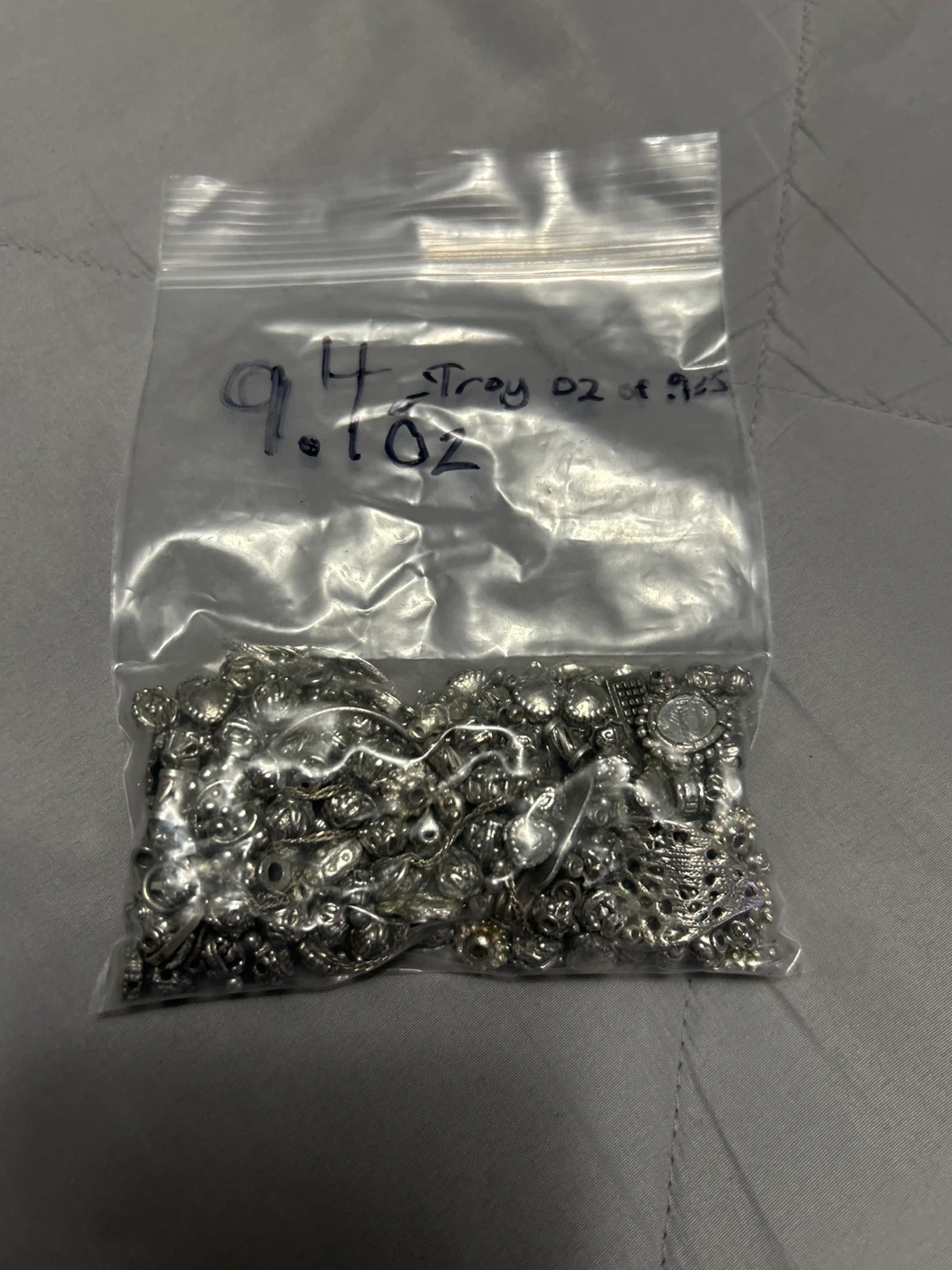 - Bag of silver beads,chains,pendants and what have you. All have been tested with a magnet and are marked as sterling silver. 9.4 Troy oz of .925 silver which equates to 8.7 troy oz of pure silver content. I’m selling for a little under spot since it’s junk meant to be melted down.