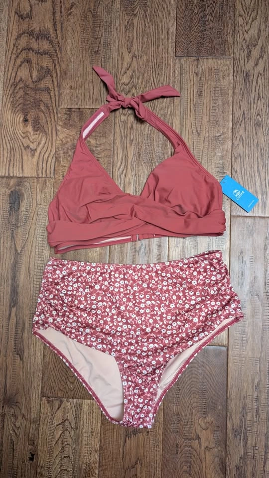 CUPSHE Women's Bikini Sets Two Piece Bathing Suit High Waisted V Neck Halter Front Twist Back Hook Textured; Brick Red/Floral