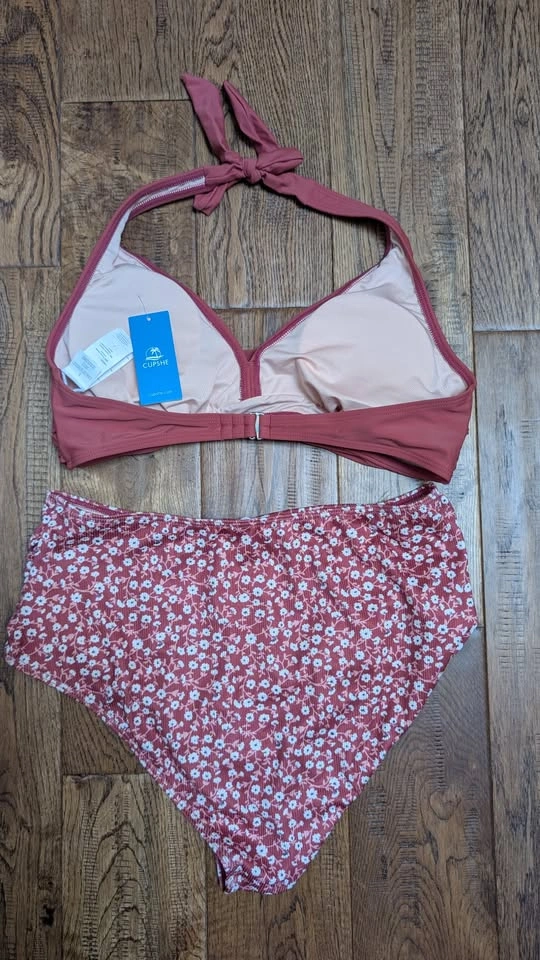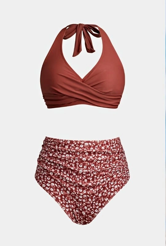 CUPSHE Women's Bikini Sets Two Piece Bathing Suit High Waisted V Neck Halter Front Twist Back Hook Textured; Brick Red/Floral