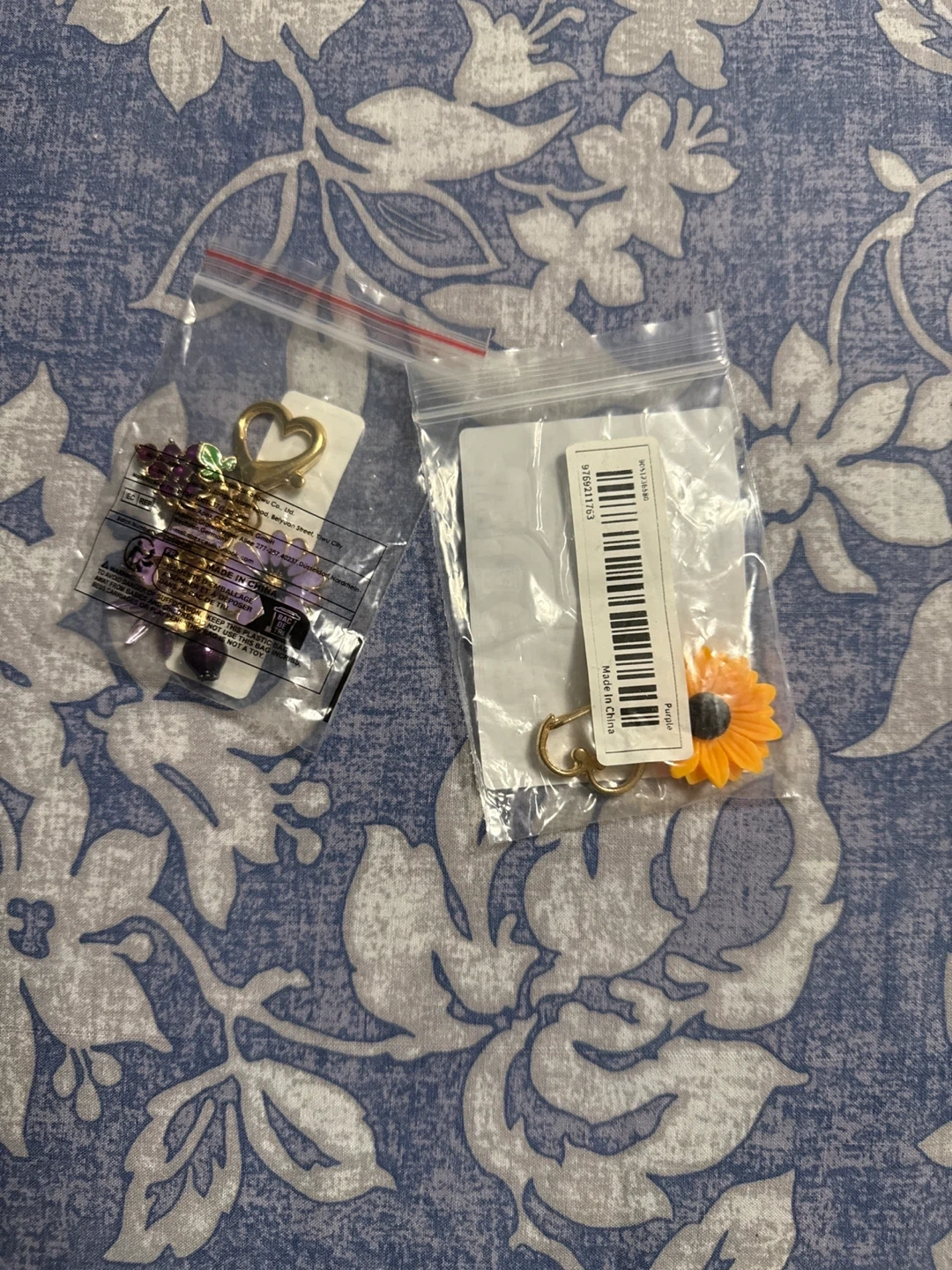These cute flower charms are perfect for adding a bit of flair to your keys or bag! One features a bright sunflower, and the other has lovely purple florals