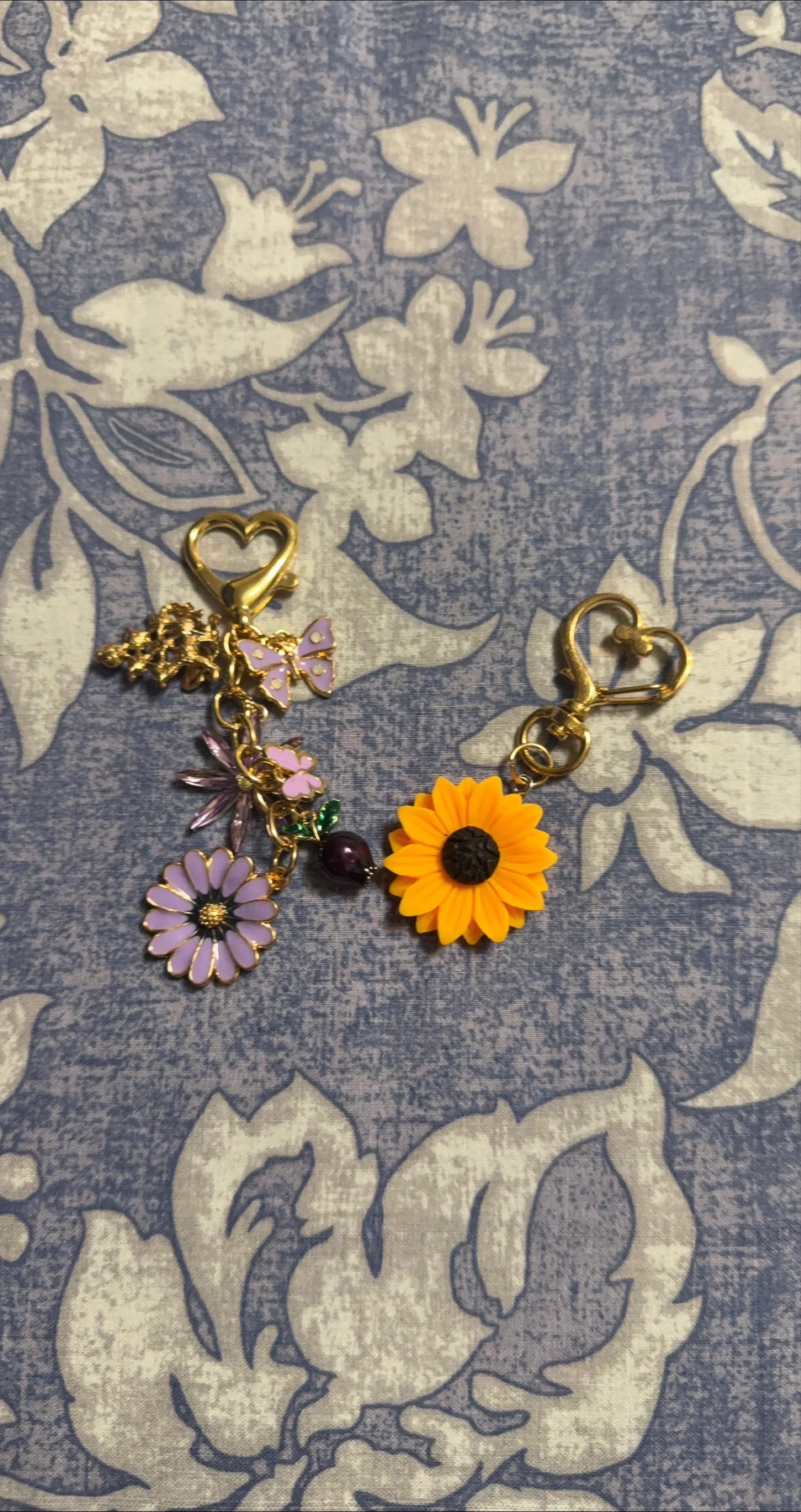 These cute flower charms are perfect for adding a bit of flair to your keys or bag! One features a bright sunflower, and the other has lovely purple florals