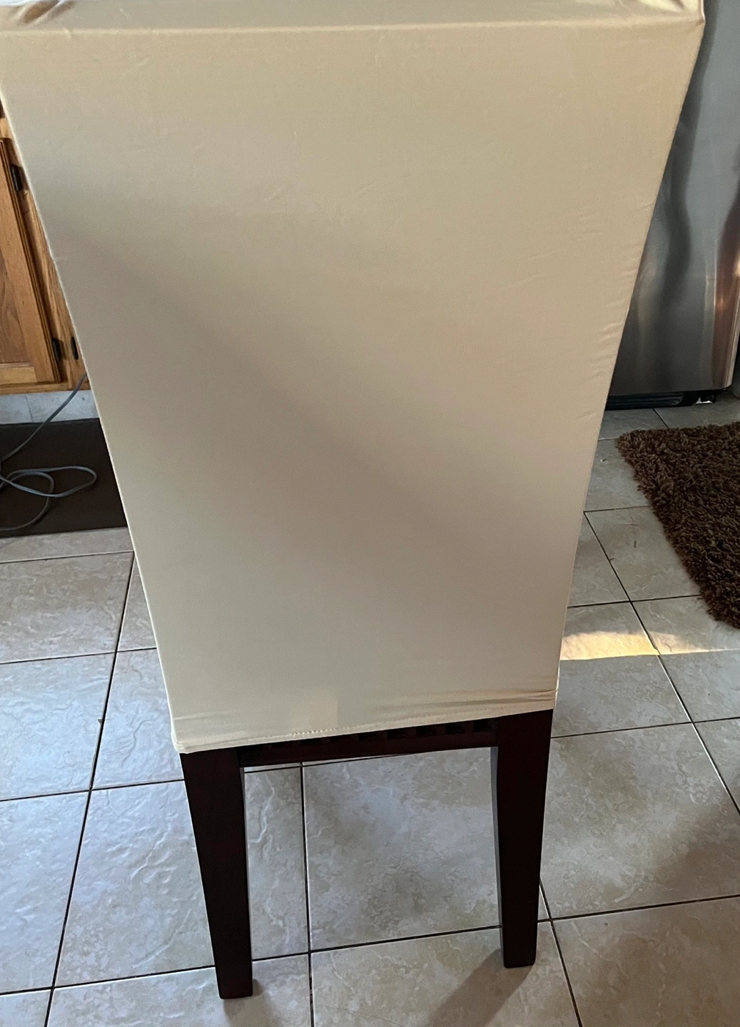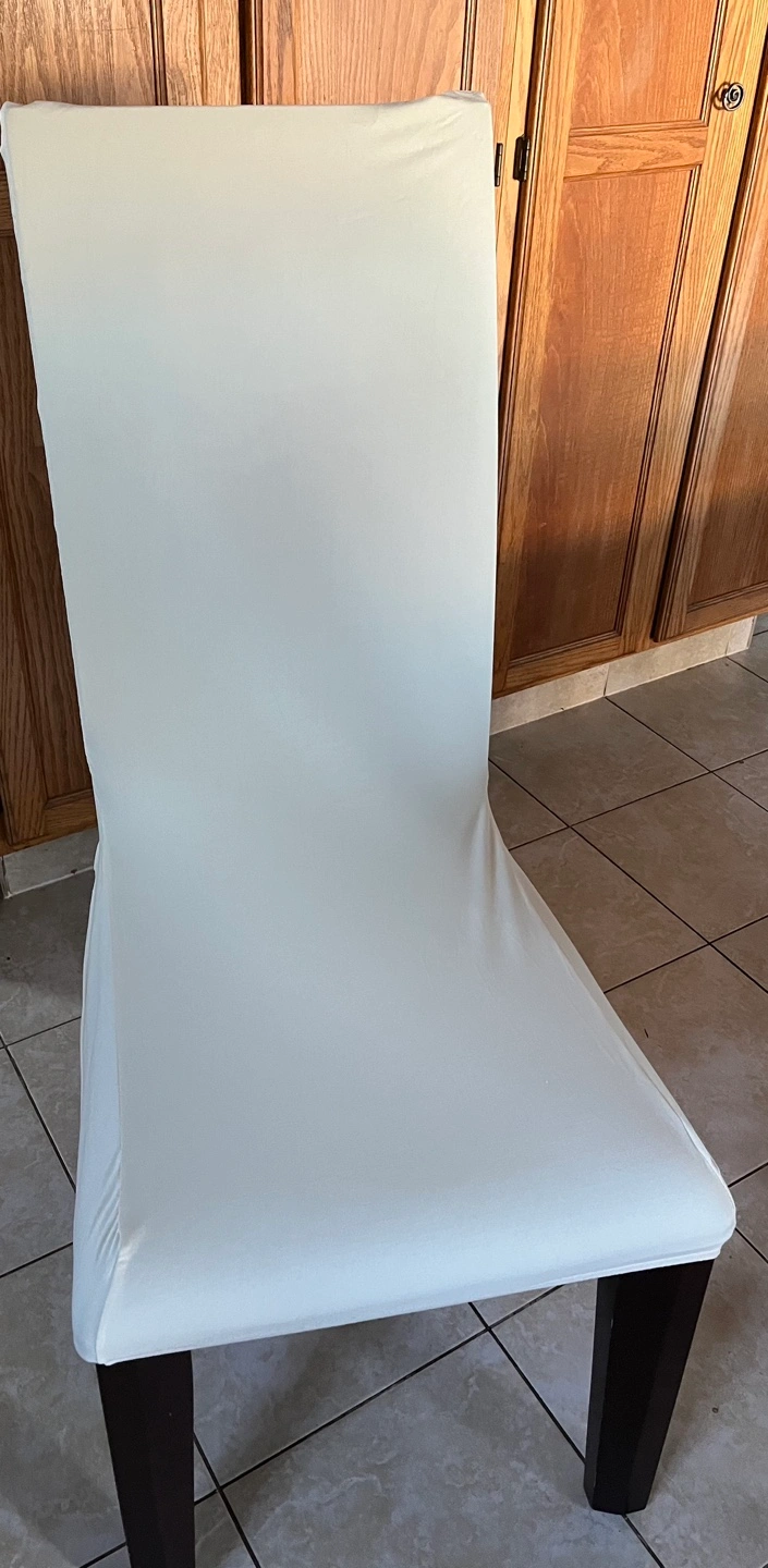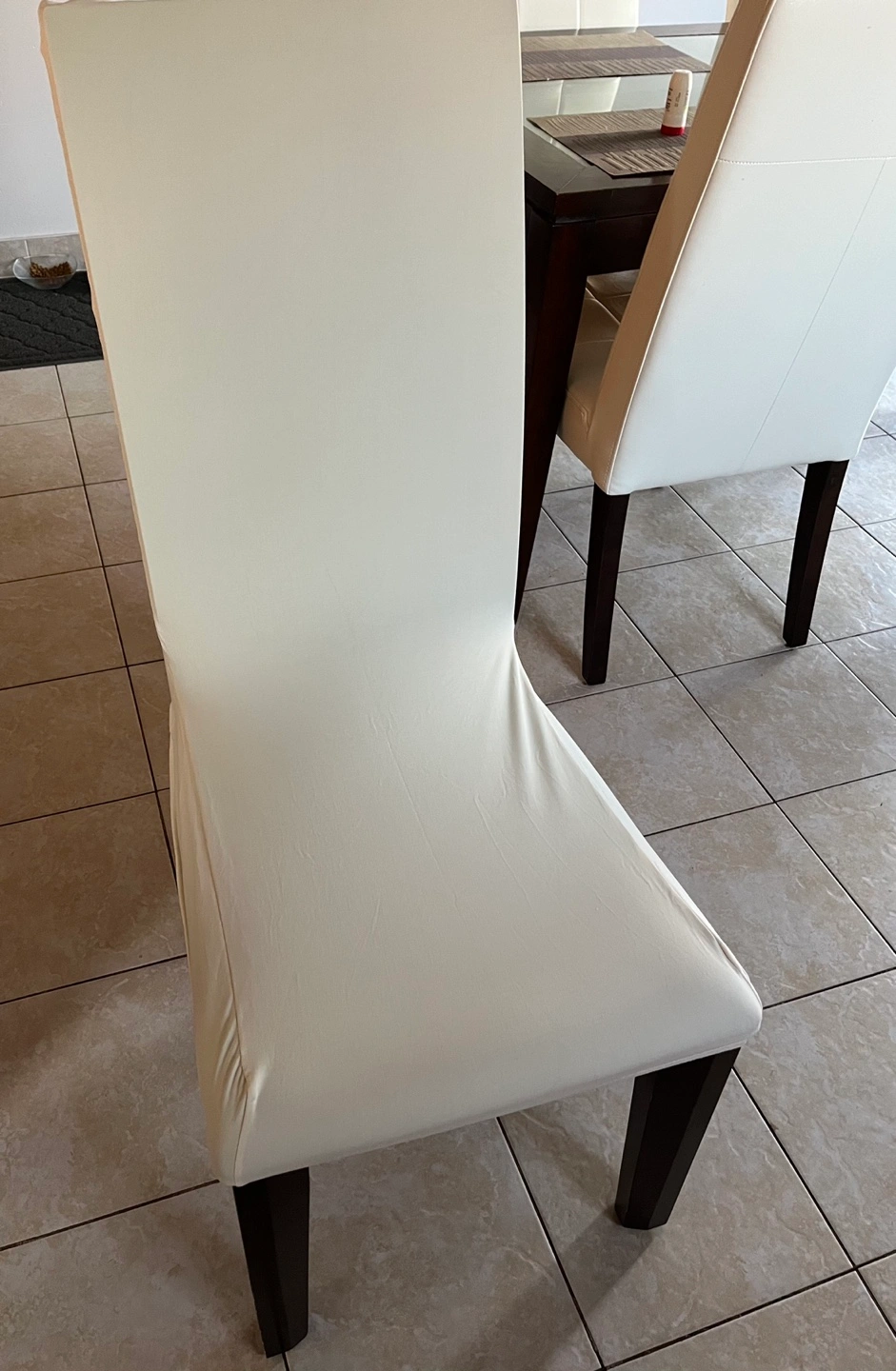 Selling a set of four chair covers! They brand new and ready to give your dining chairs a fresh, clean look. The covers are made of 92% polyester and 8% spandex, so they're nice and stretchy. They're a lovely beige colour that will match almost any decor