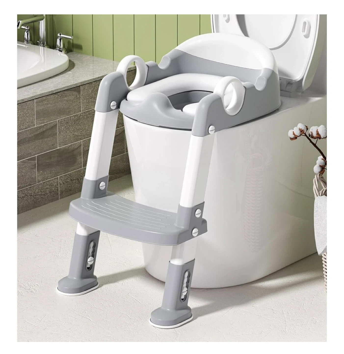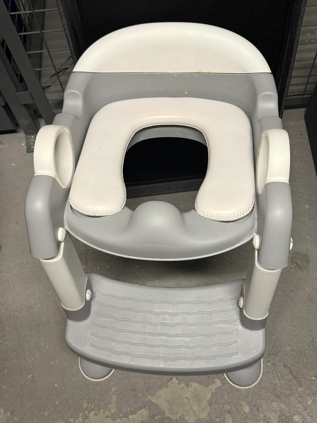 Get your little one ready for the big potty with this handy training seat! It features a comfortable seat with handles and a sturdy ladder to help them climb up with ease. The grey and white colour scheme will fit nicely in most bathrooms. It fits standard height (15-16") and comfort height (17-19") toilets.