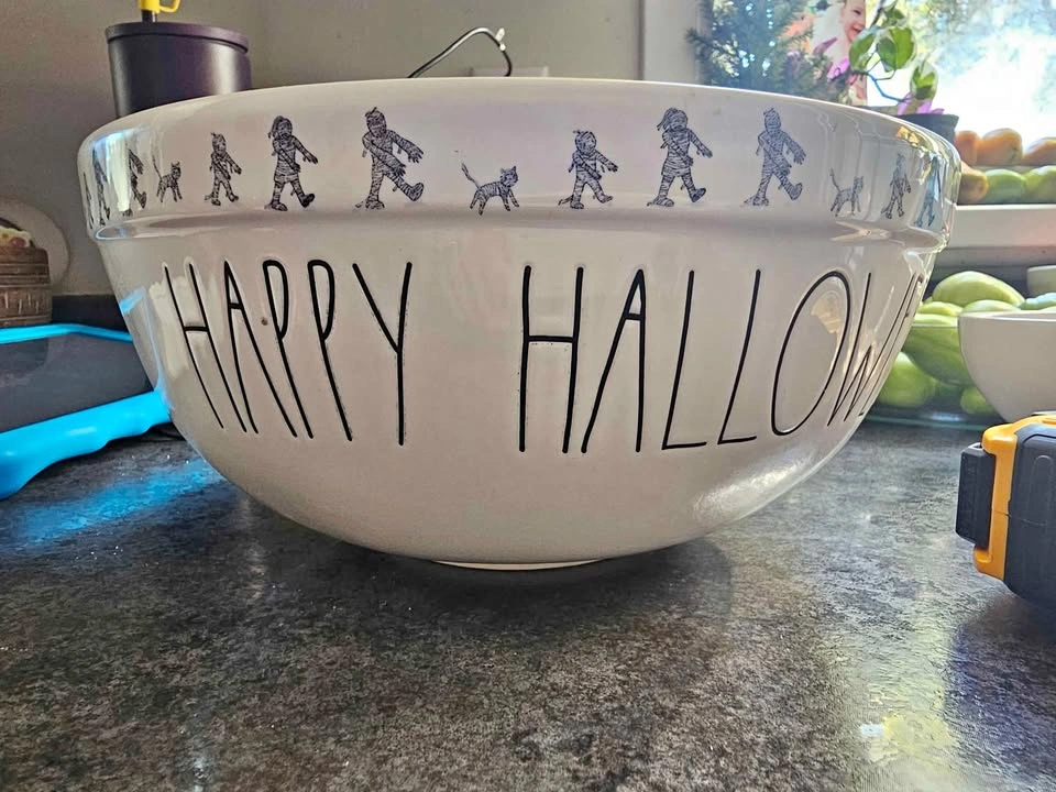 Large halloween candy bowl, 10 inches wide. Black inside and a cute mummy design along the rim, happy Halloween across the front of the bowl. Rae Dunn Holiday Decor