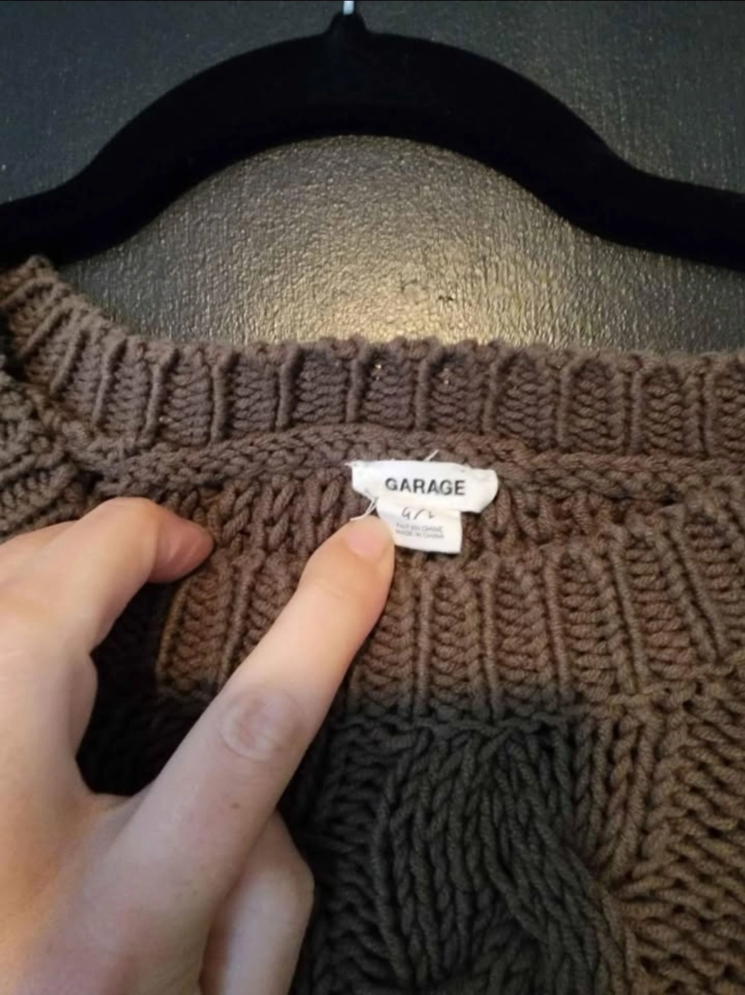 Cozy up in this stylish Garage cropped knit sweater! It's a lovely green colour, pictures do not show the colour well but is a darker green, and features a unique cable knit distressed design. The sweater is a size L/G and would be a great addition to your fall or winter wardrobe. Brand new without tags.