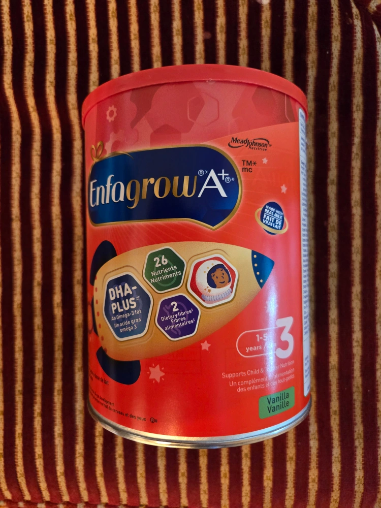 Selling a can of Enfagrow A+ Stage 3 toddler nutrition. It's designed to support your child's nutrition from 1-5 years old. It contains DHA-Plus, an Omega-3 fat, and dietary fibres. It also has 26 nutrients and comes in a vanilla flavour!