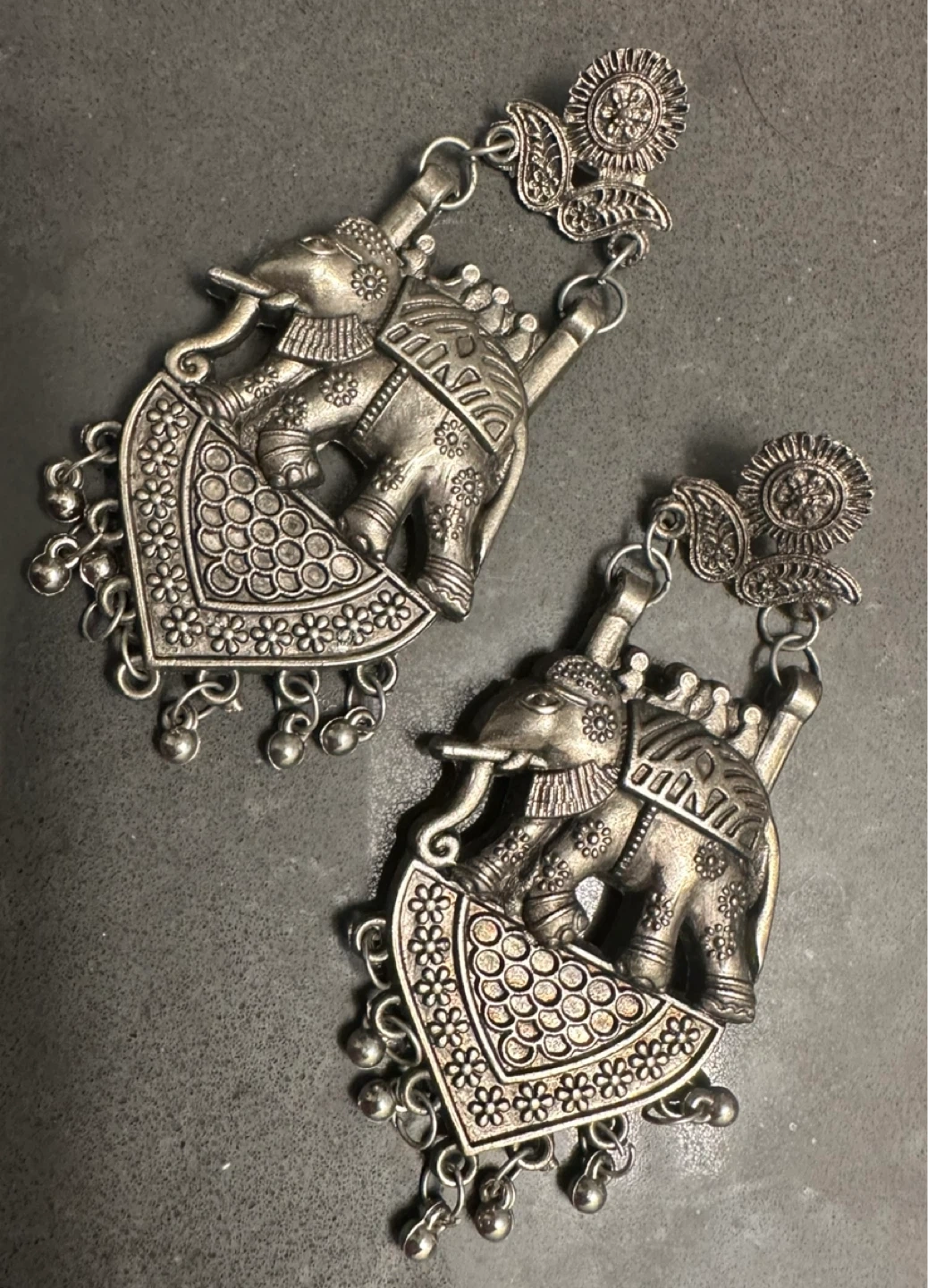 These are a pair of silver-tone dangle earrings featuring an intricate elephant design. They have a unique and eye-catching look, perfect for adding a touch of cultural flair to any outfit!