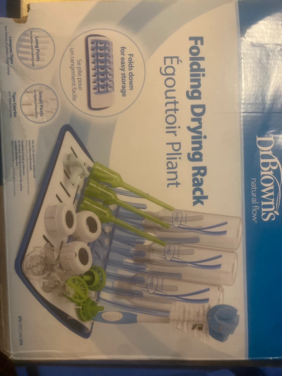 Selling a Dr. Brown's natural flow folding drying rack. It folds down for easy storage and is in great condition. It fits all Dr. Brown's bottles and most other bottle brands. Perfect for organizing baby bottles and accessories!