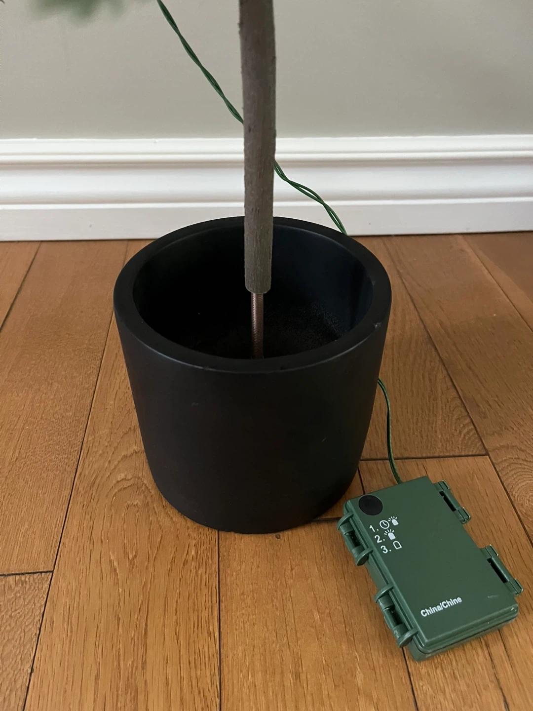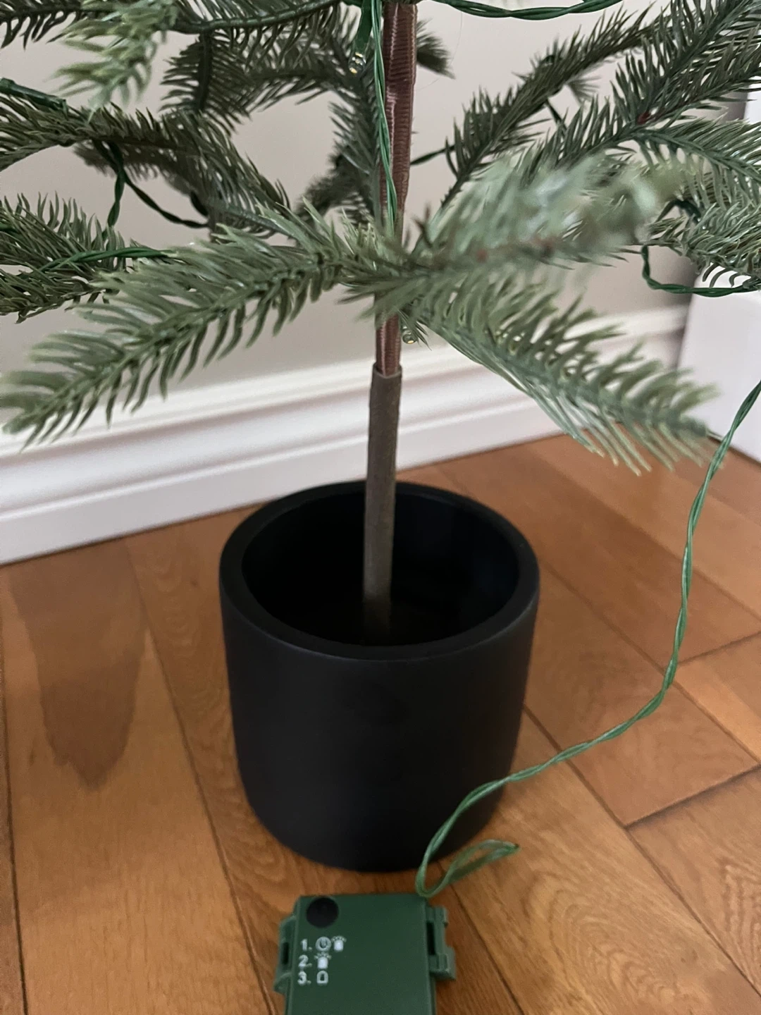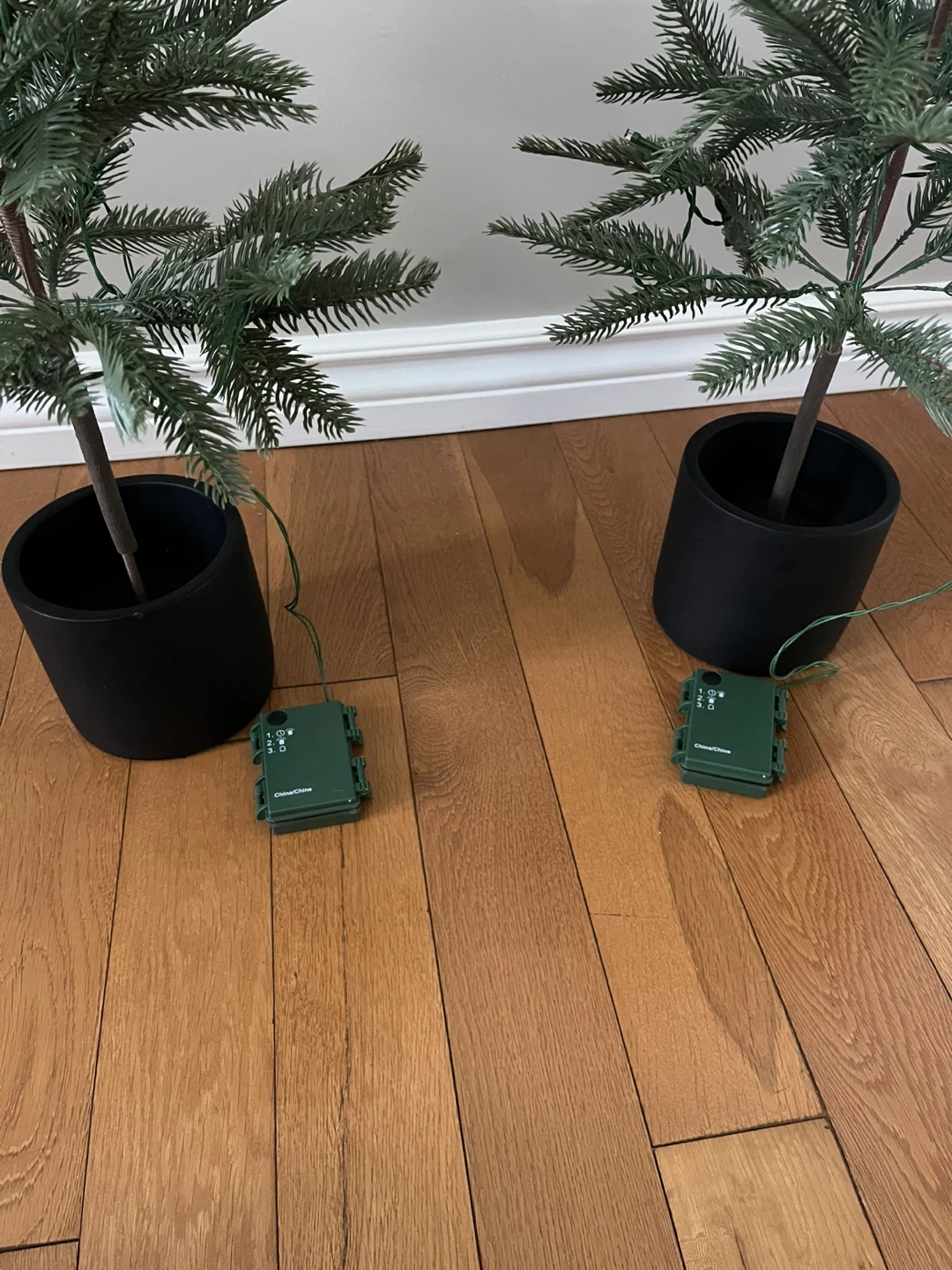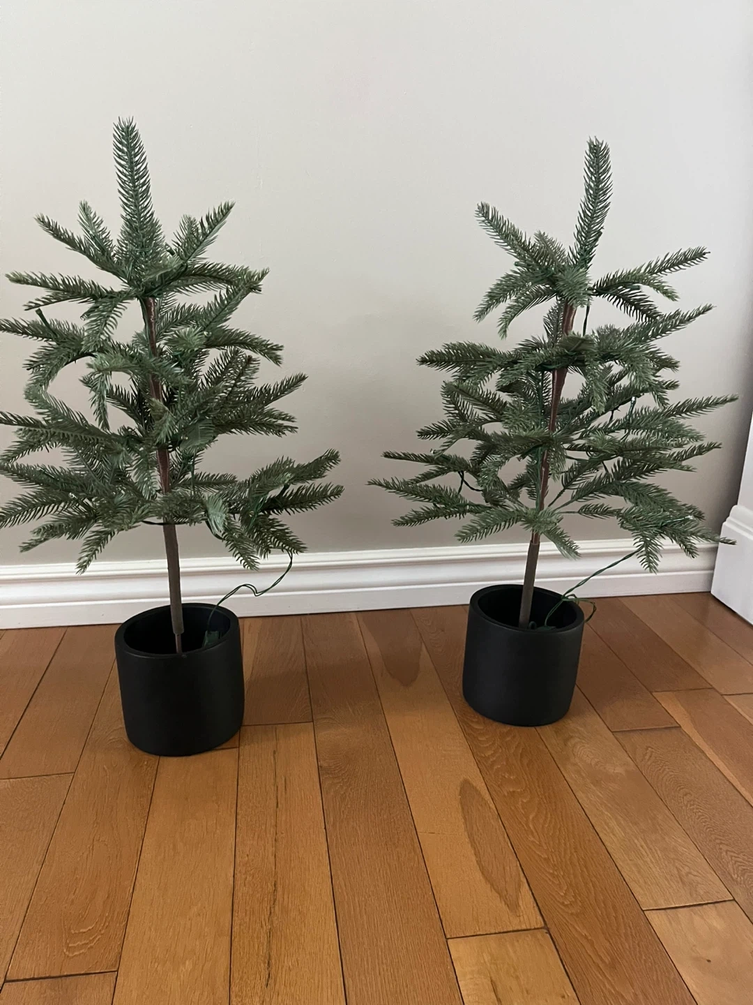 Selling a set of two mini artificial Christmas trees, approx 24 inches in height, perfect for adding a festive touch to any space! They come with built-in lights and a sleek black pot. Great for tabletops or small corners that need some holiday cheer. 3AA batteries for each tree, price is for both