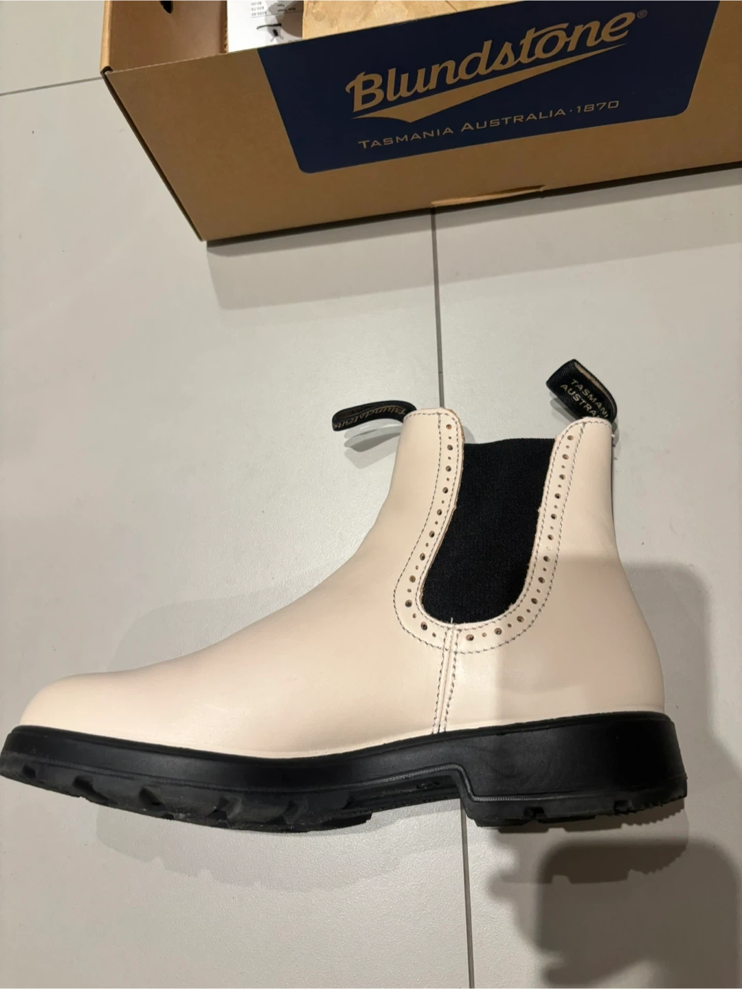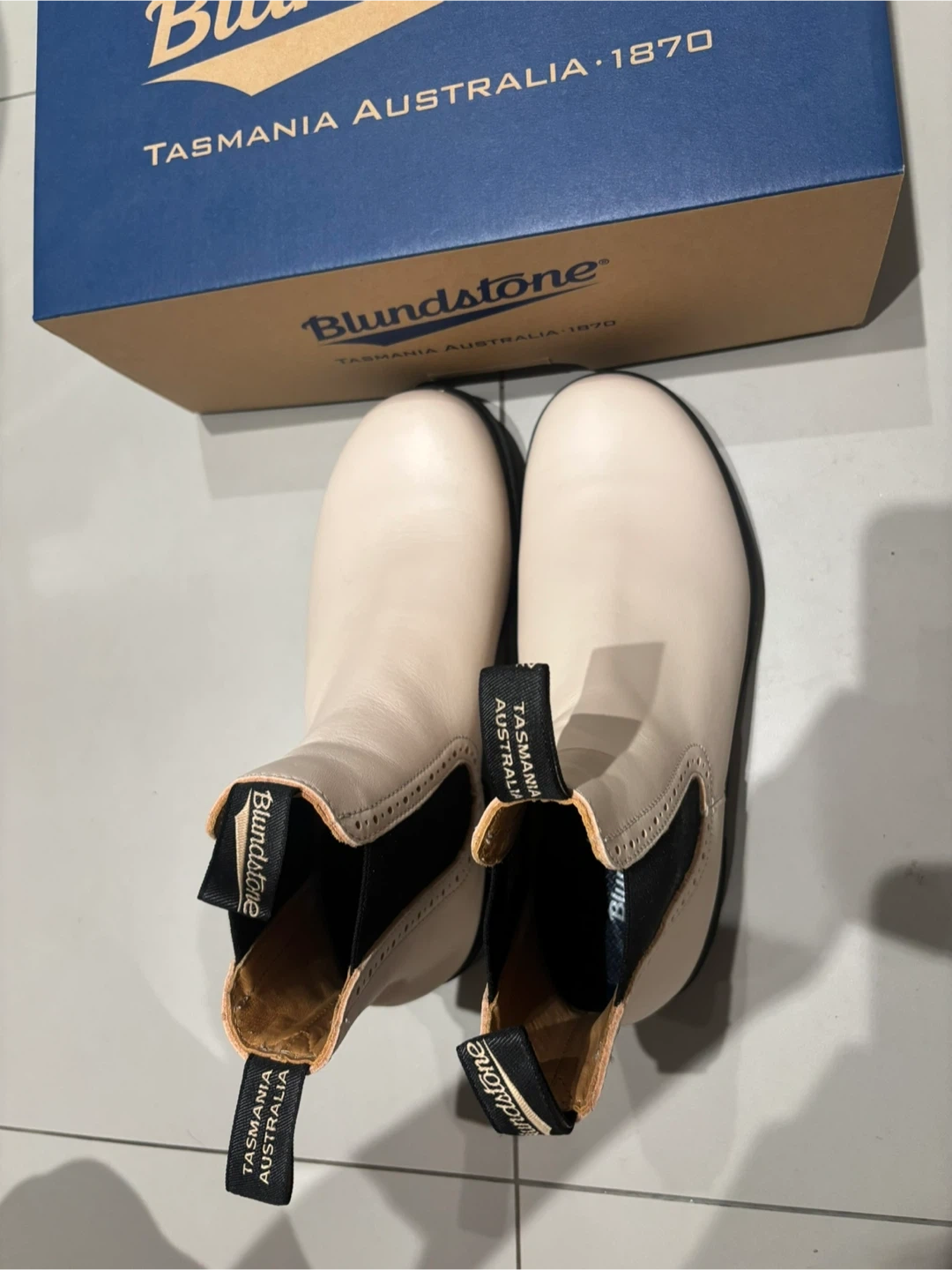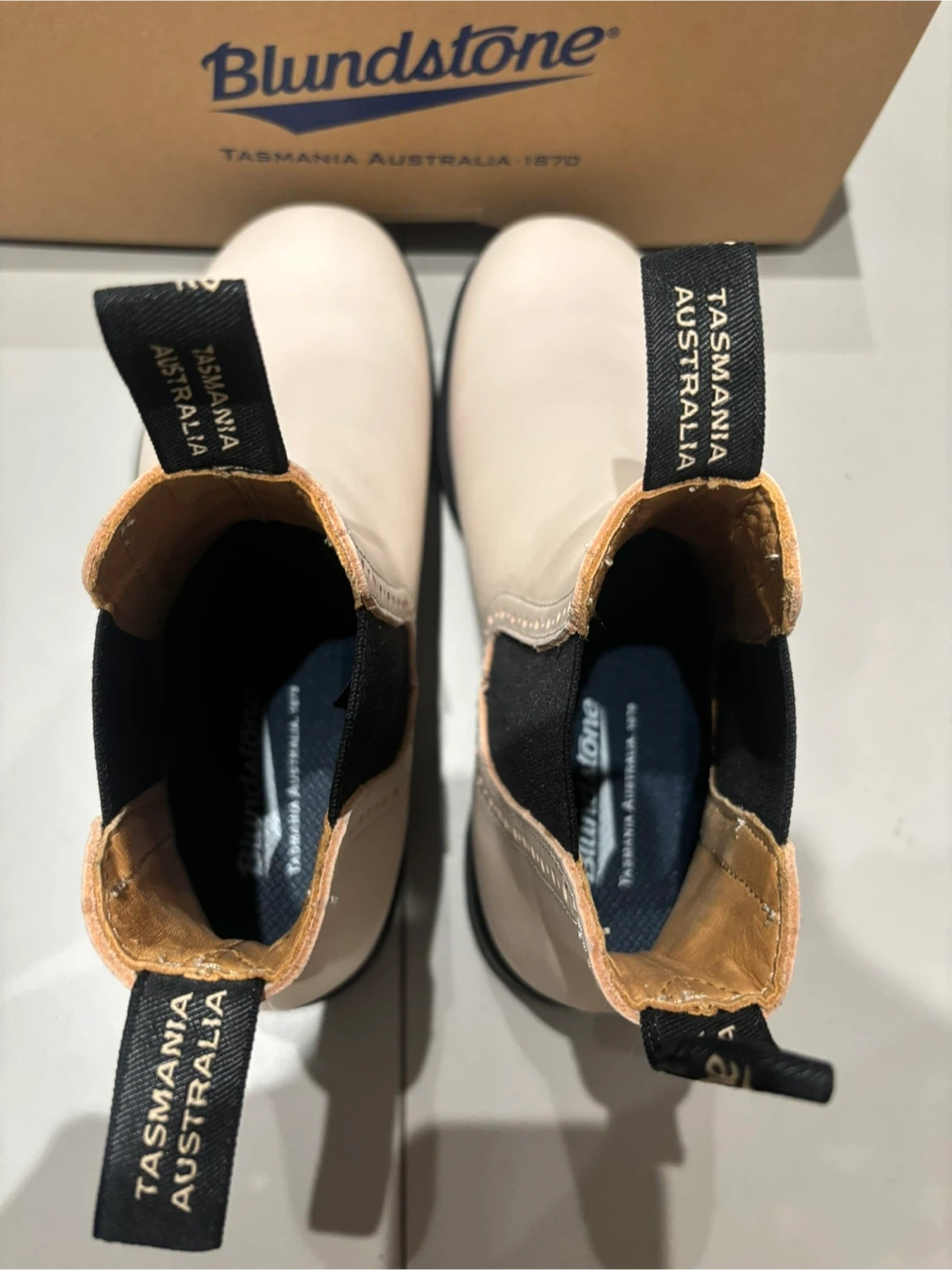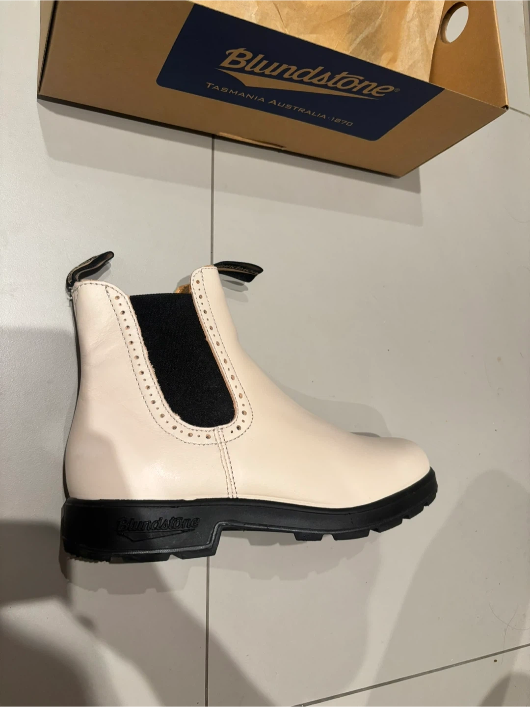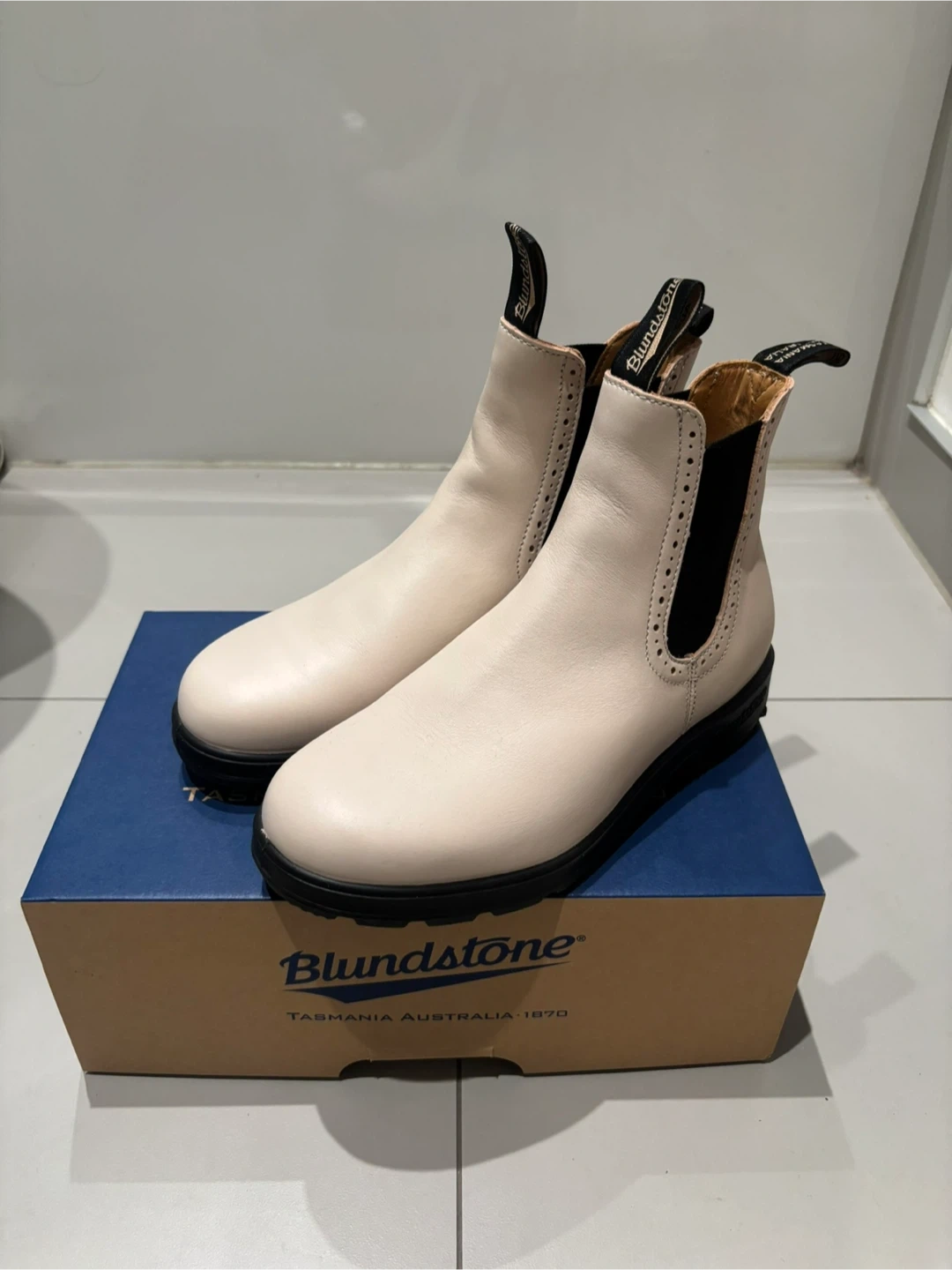 Selling a pair of Blundstone women's heeled boots in a lovely off-white colour! They're in great condition and come with the original box. Perfect for adding a touch of style to any outfit!