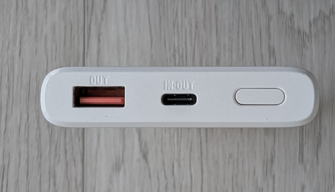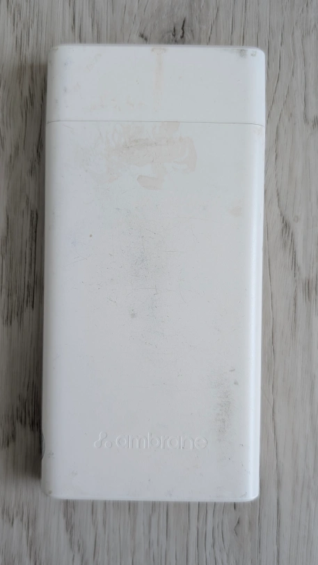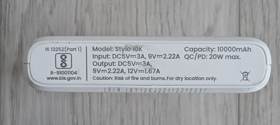 Selling an Ambrane Stylo 10K power bank. It has a capacity of 10000mAh and supports QC/PD 20W max for fast charging. Input is DC5V=3A, 9V=2.22A, and output is DC5V=3A, 9V=2.22A, 12V=1.67A