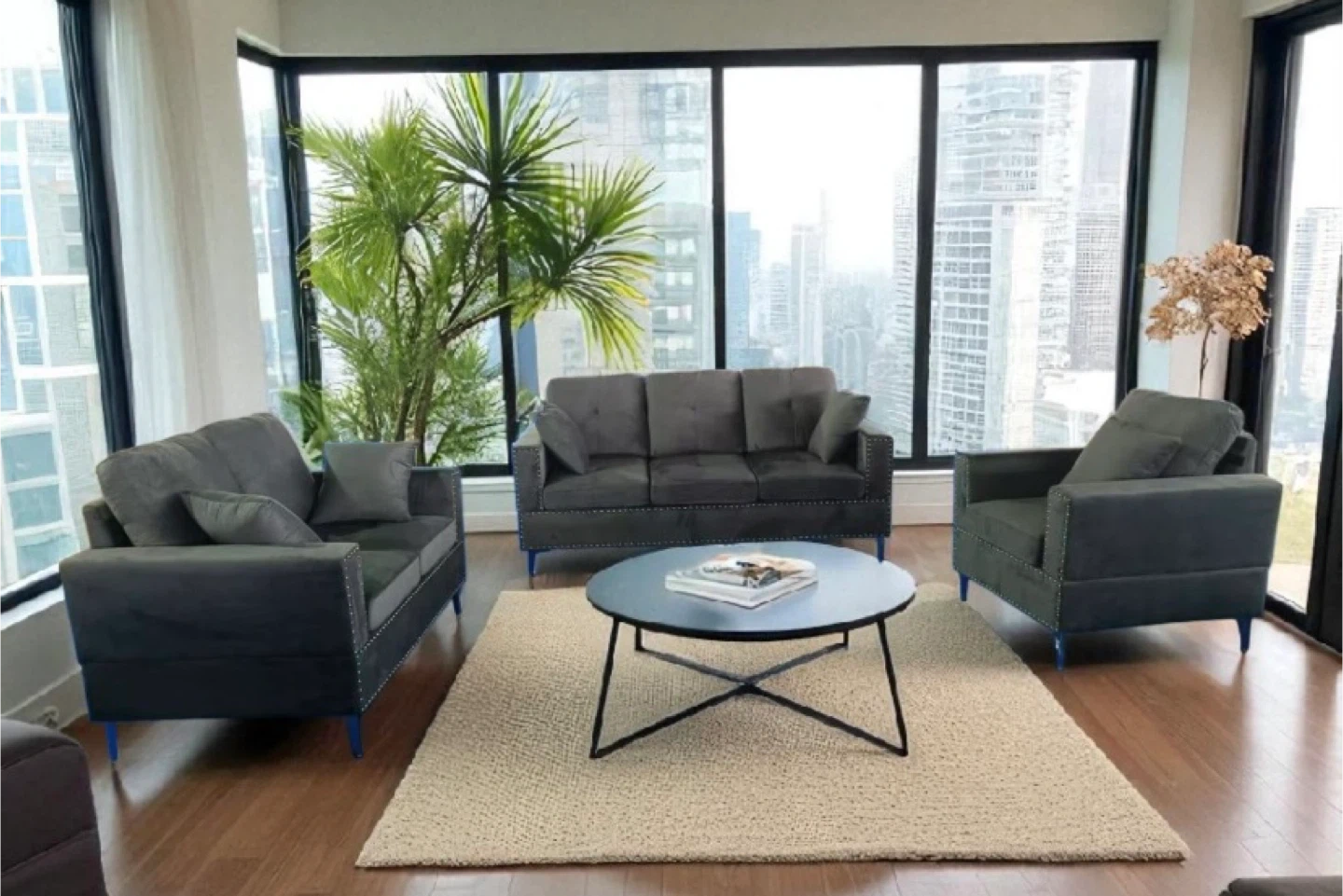 Selling a sofa set that includes a loveseat, a sofa, and an armchair. The set is a stylish grey colour and would be a great addition to any living room!