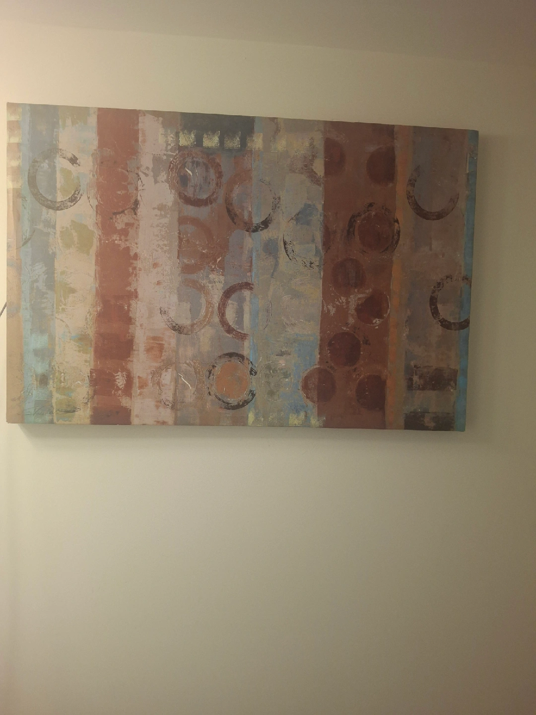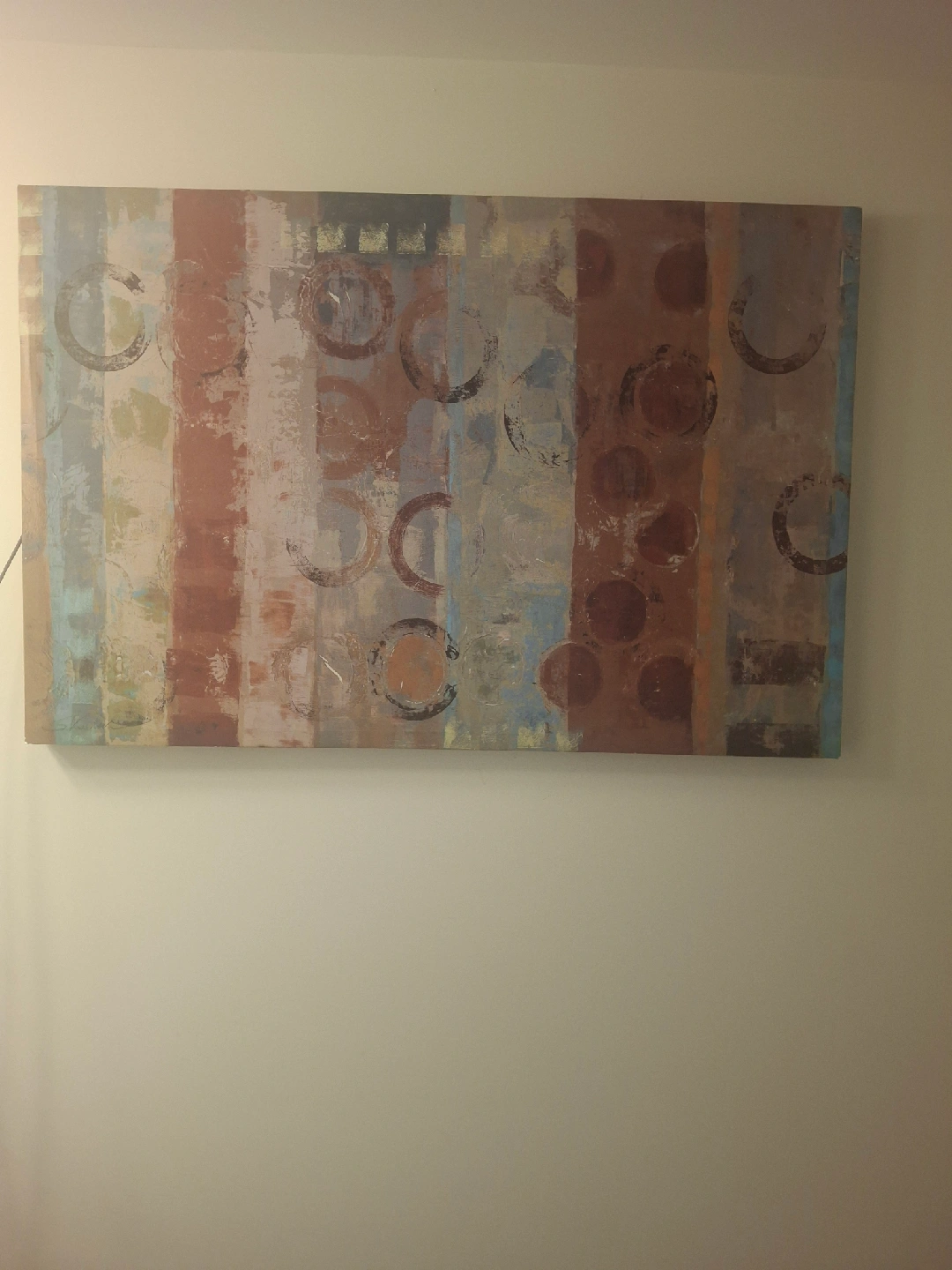 Here's a piece of abstract wall art that could be perfect for your space! It features a blend of colours and textures, with a pattern of stripes and circles. It's in great condition and ready to hang!