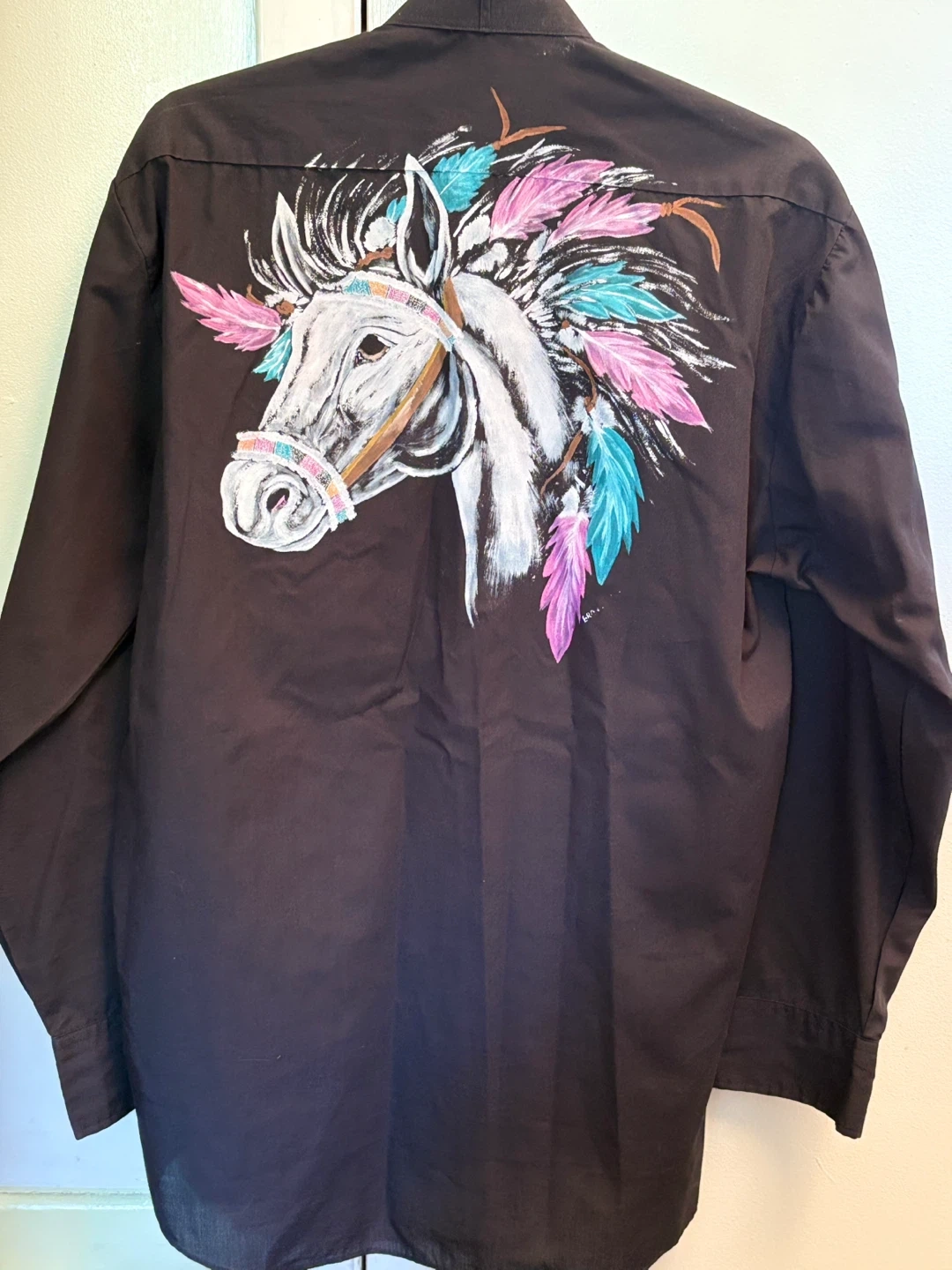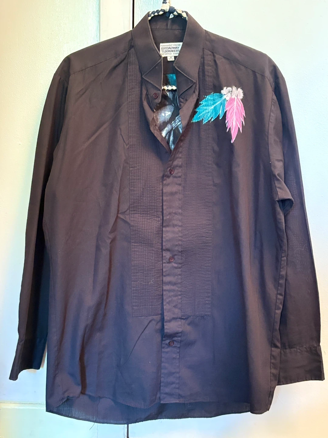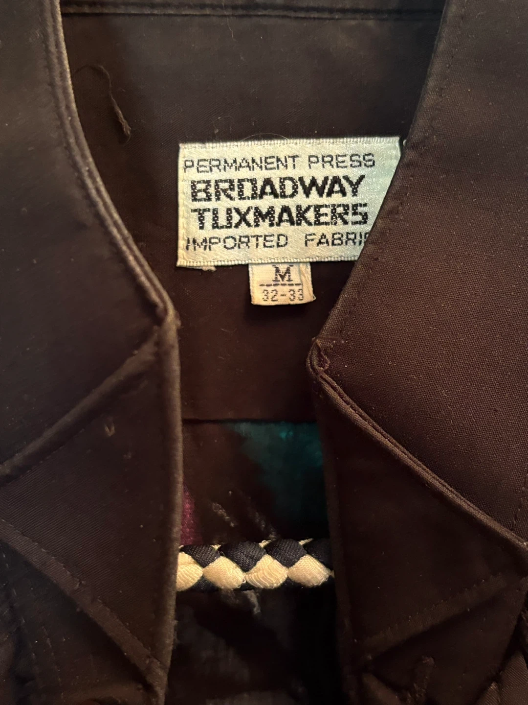 96Broadway Tuxmakers shirt in size M. It's a permanent press shirt with an imported fabric. Features handpainted design on the front and back.