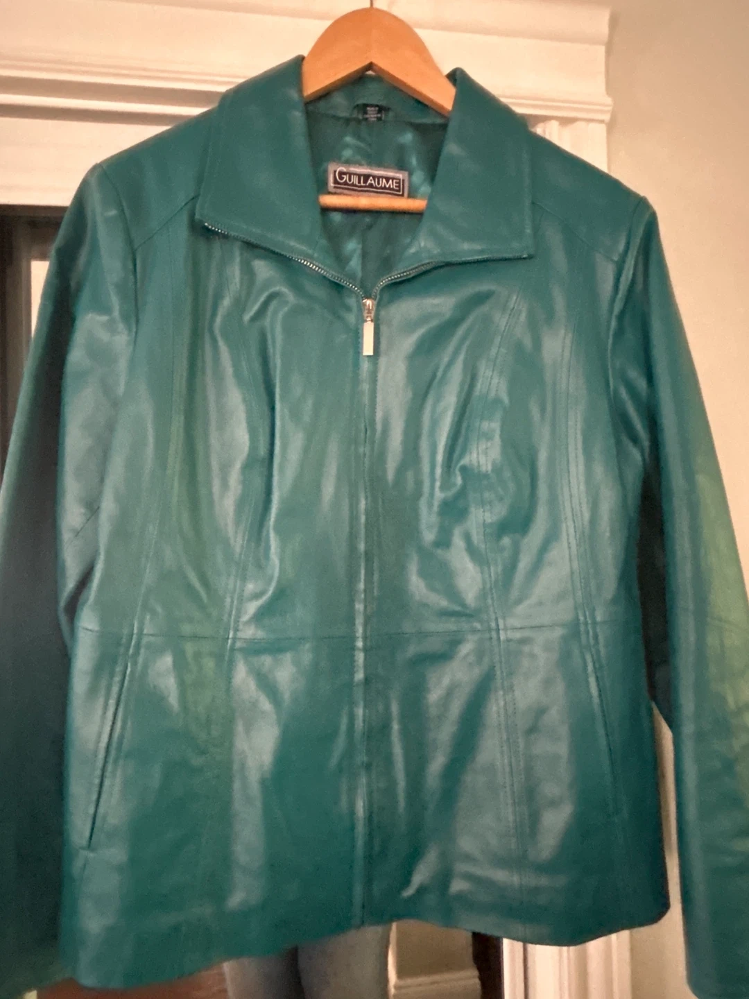 Here's a stylish Guillaume jacket in a beautiful green colour! It's made of leather and is a size L/G. Perfect for adding a pop of colour to your wardrobe!