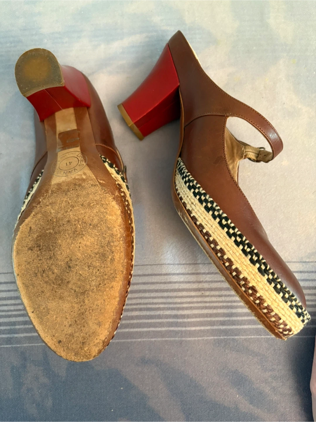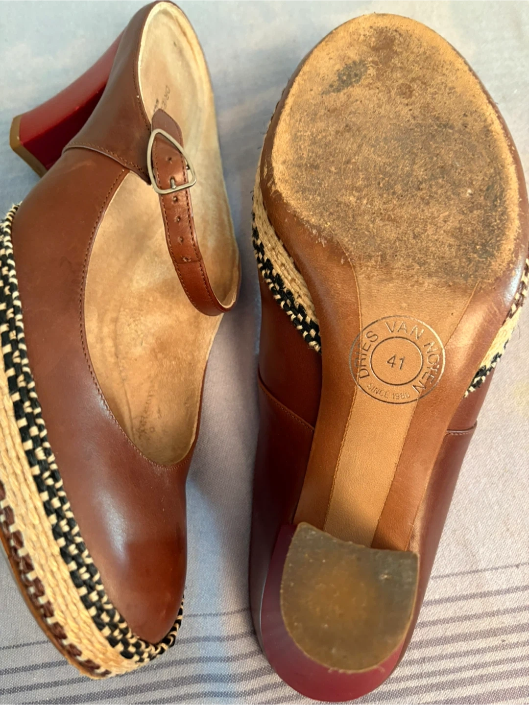 Selling a pair of Dries Van Noten heels in size 41. These stylish heels feature a unique design with brown leather and woven detailing. The red block heel adds a pop of colour. They show some signs of wear on the interior and strap but are still in good condition. Very comfortable!