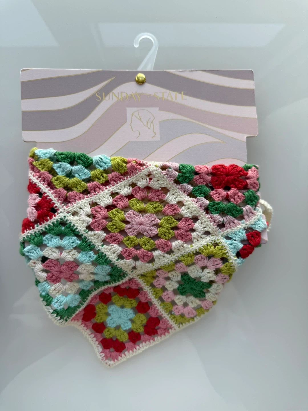 1000+This is a cute crochet bandana from Sunday State! It's made of 100% polyester and features a colourful, patchwork design. Perfect for adding a touch of handmade charm to your outfit