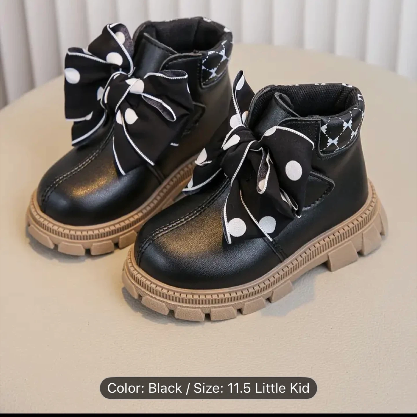These adorable ankle boots are in black and size 11.5 (Little Kid)! They feature a cute bow detail and a sturdy sole, perfect for your little one's adventures