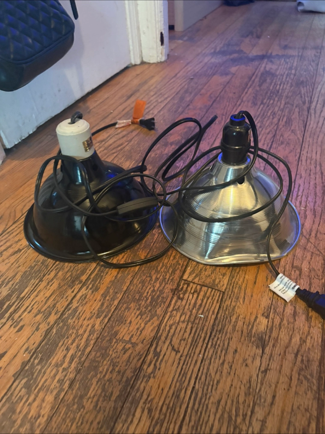 Selling two reptile heat lamps! One is black and the other is silver. They're both in good working condition and ready to keep your reptile friends nice and toasty