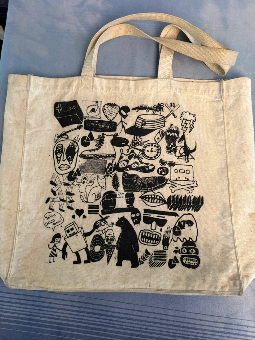 Selling a tote bag with unique, fun animations. It's a great size, have brought this to the beach many times. The bag is durable and has sturdy straps.