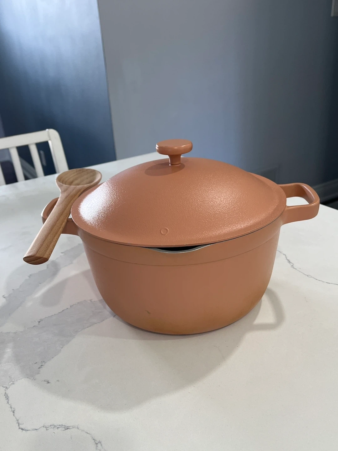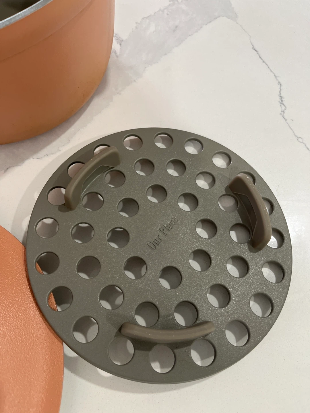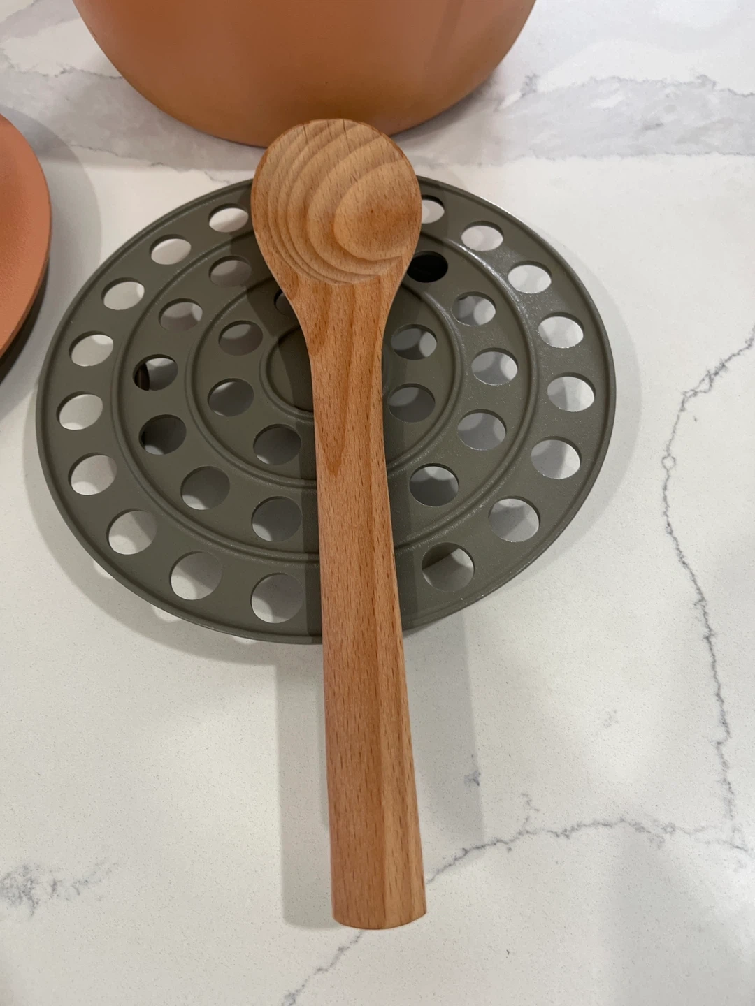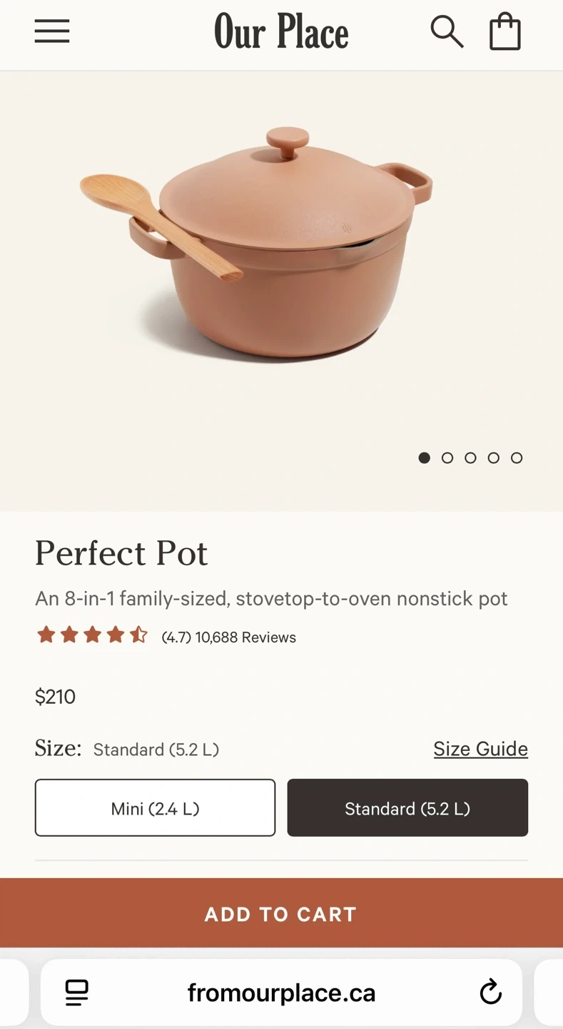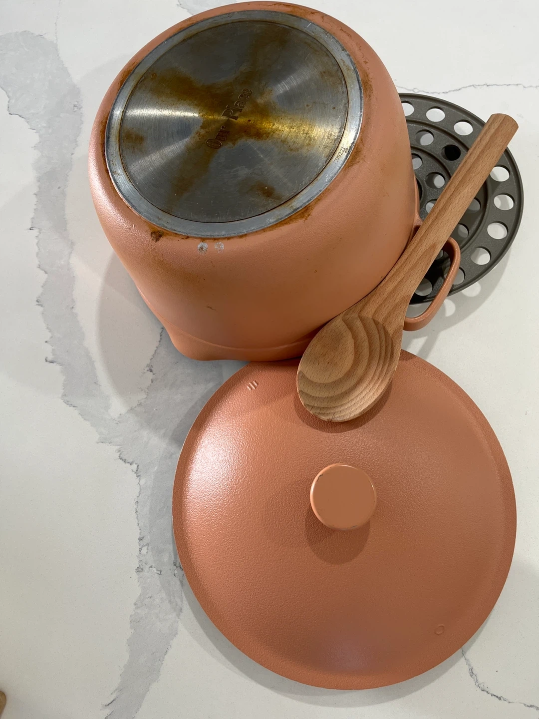 Selling an Our Place Always Pot in a lovely spice colour! It comes with the steamer basket and new wooden spatula. This pan is perfect for cooking all sorts of dishes and is in great condition. It's a great addition to any kitchen!