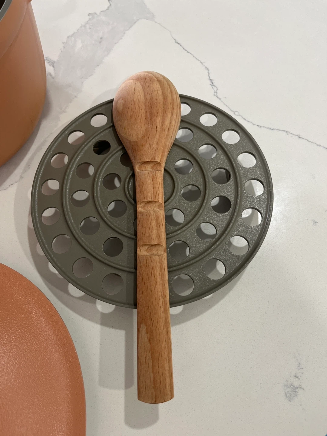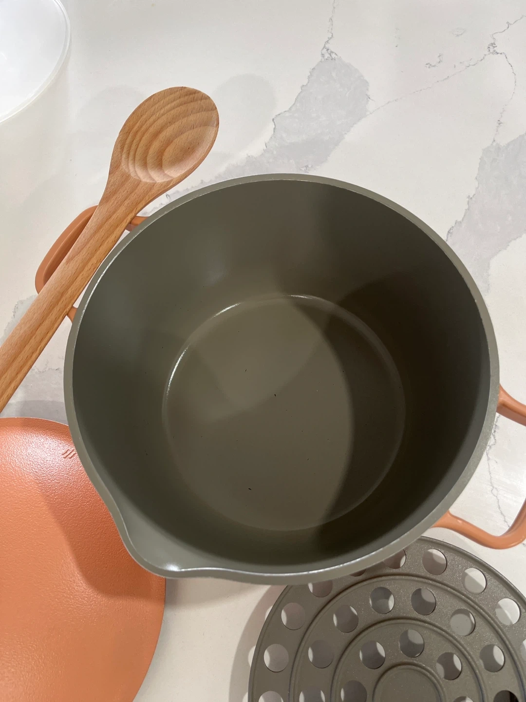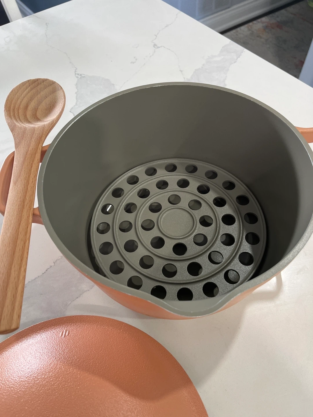 Selling an Our Place Always Pot in a lovely spice colour! It comes with the steamer basket and new wooden spatula. This pan is perfect for cooking all sorts of dishes and is in great condition. It's a great addition to any kitchen!