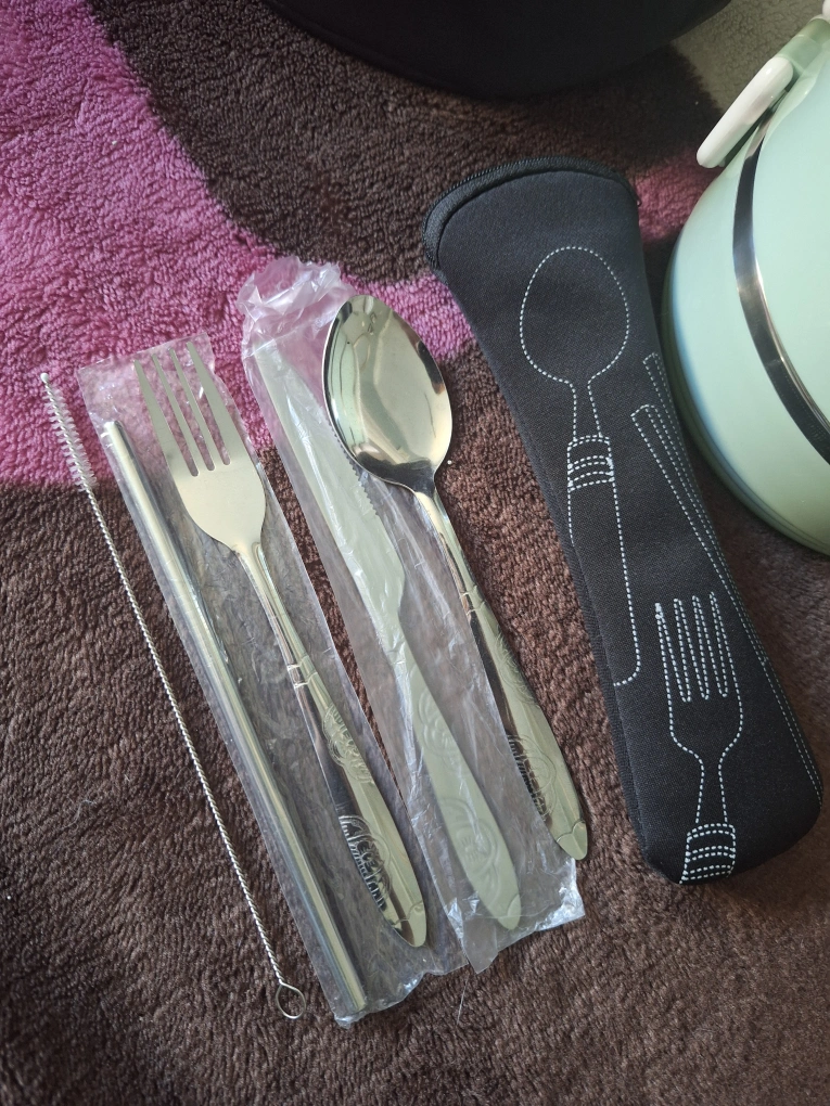 This is a 3-tier stackable lunch box with a black insulated lunch bag. It also includes a cutlery set with a stainless steel spoon, fork, knife, straw and cleaning brush. The lunch box is light green and made of stainless steel. The bag is black and has a drawstring closure.