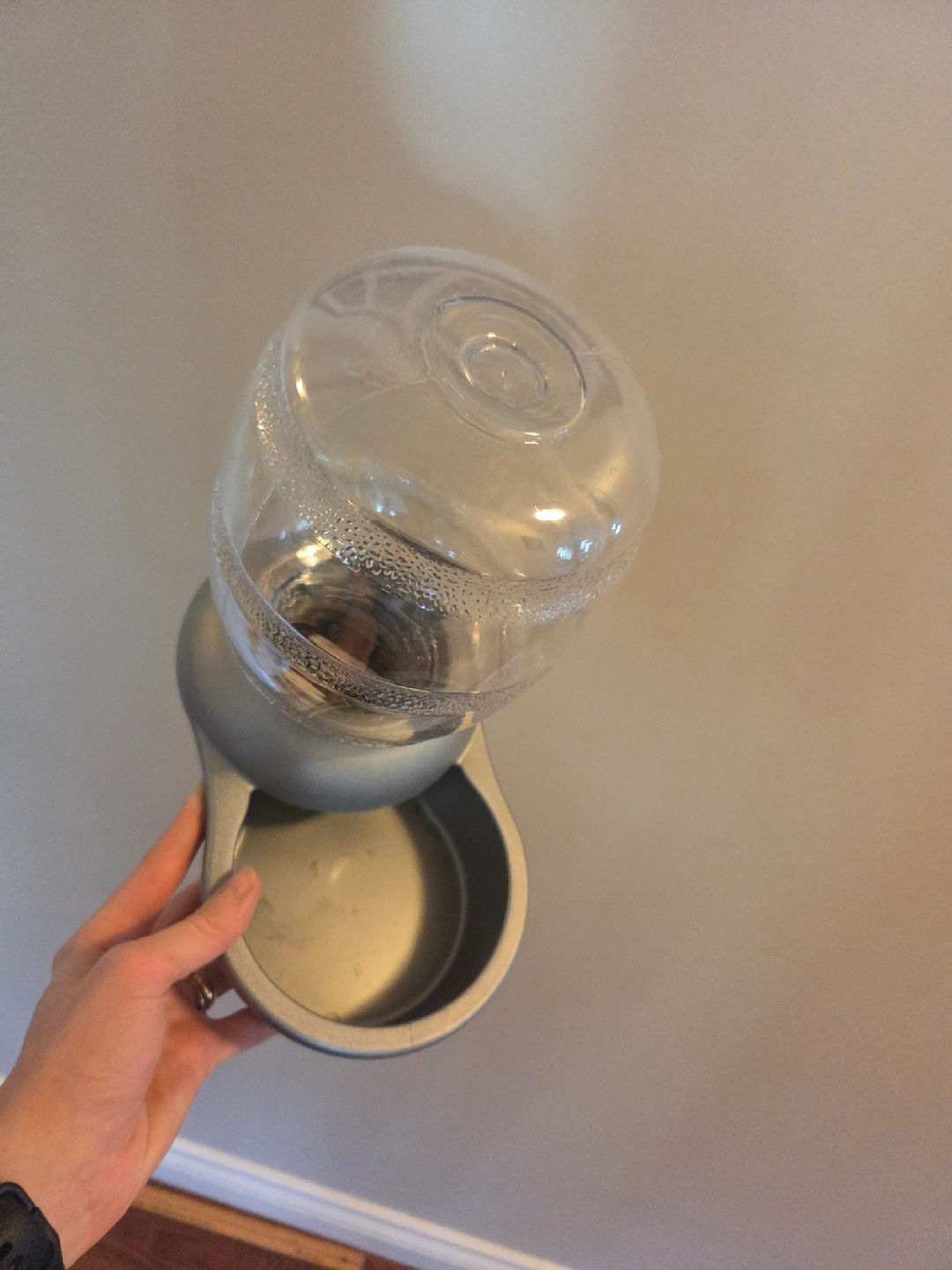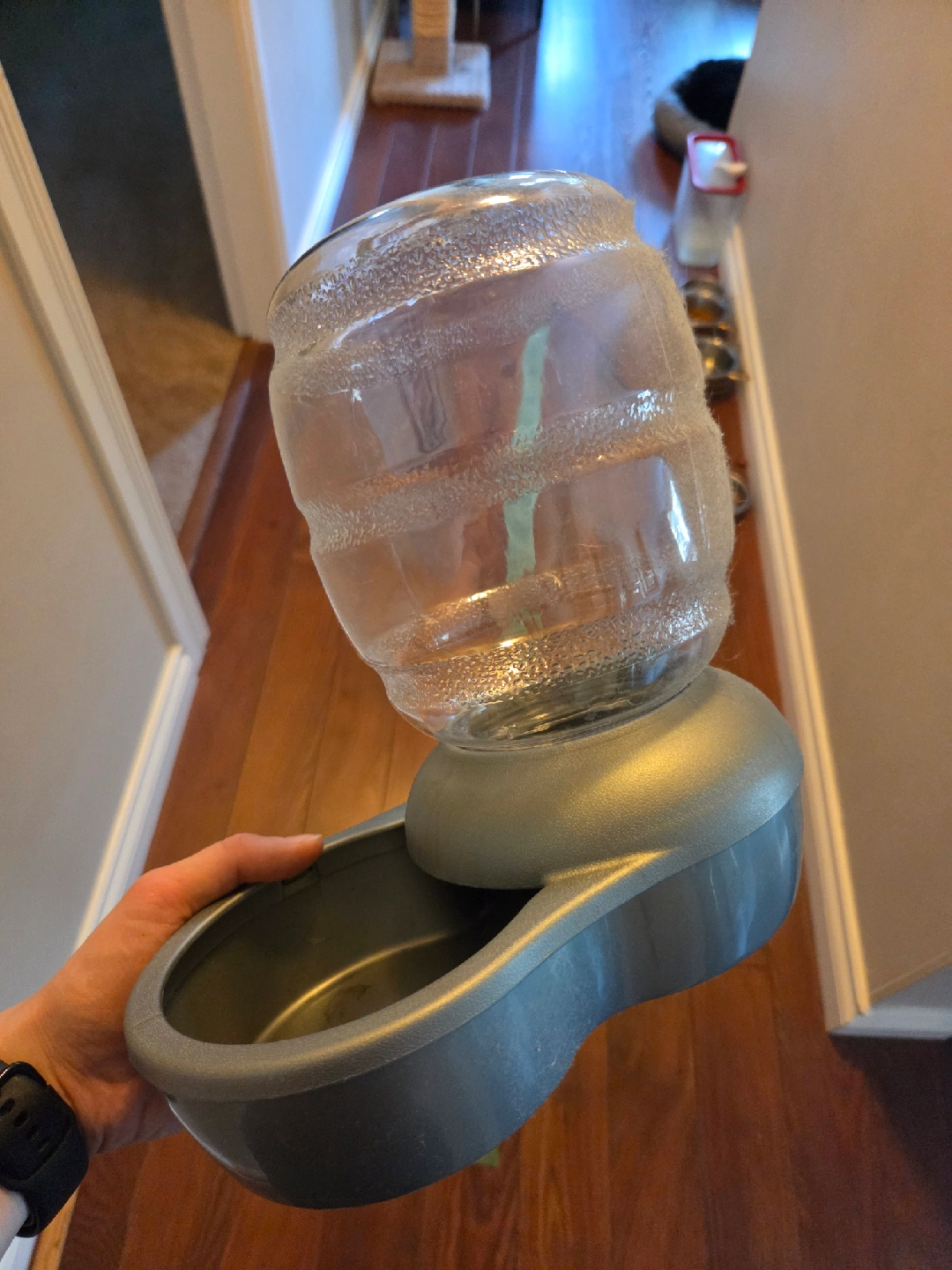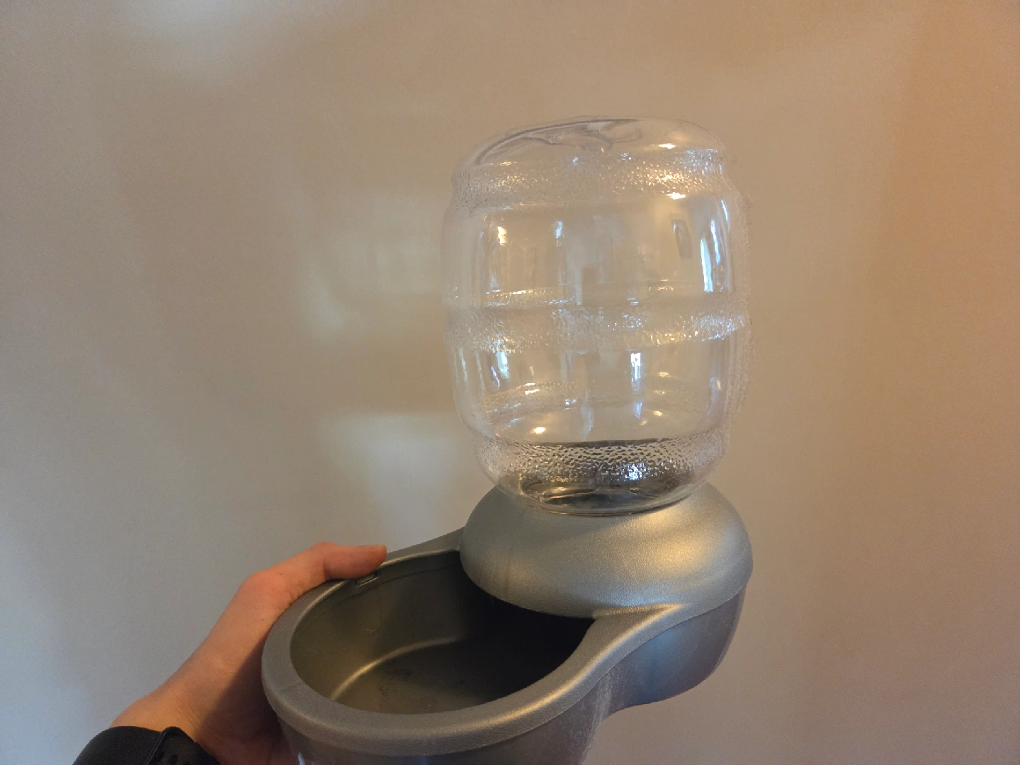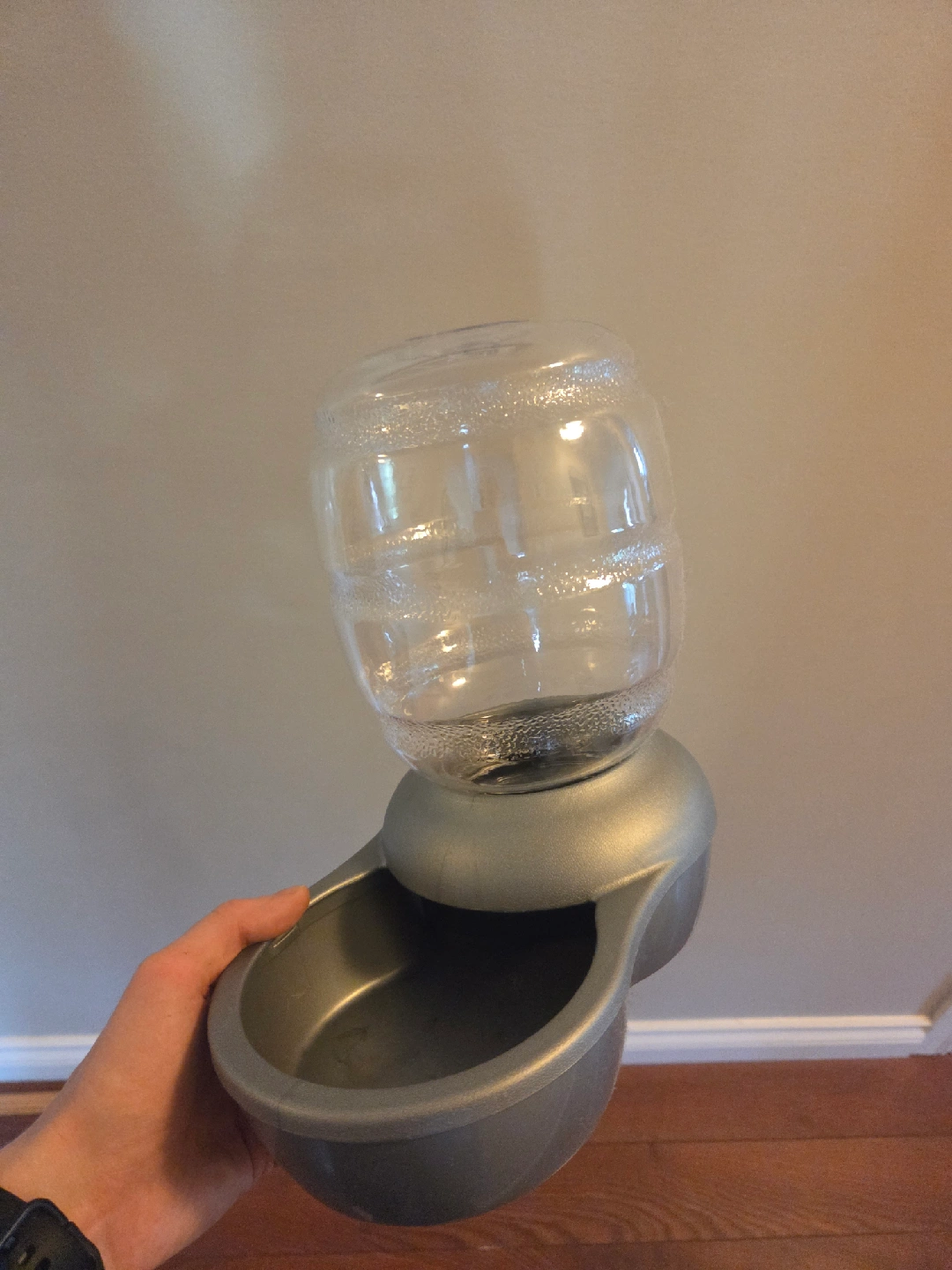 Selling a pet water dispenser! It's in great condition and perfect for keeping your furry friends hydrated. The dispenser has a clear plastic water reservoir and a grey base with a built-in bowl. It's easy to clean and refill, making it a convenient choice for busy pet owners