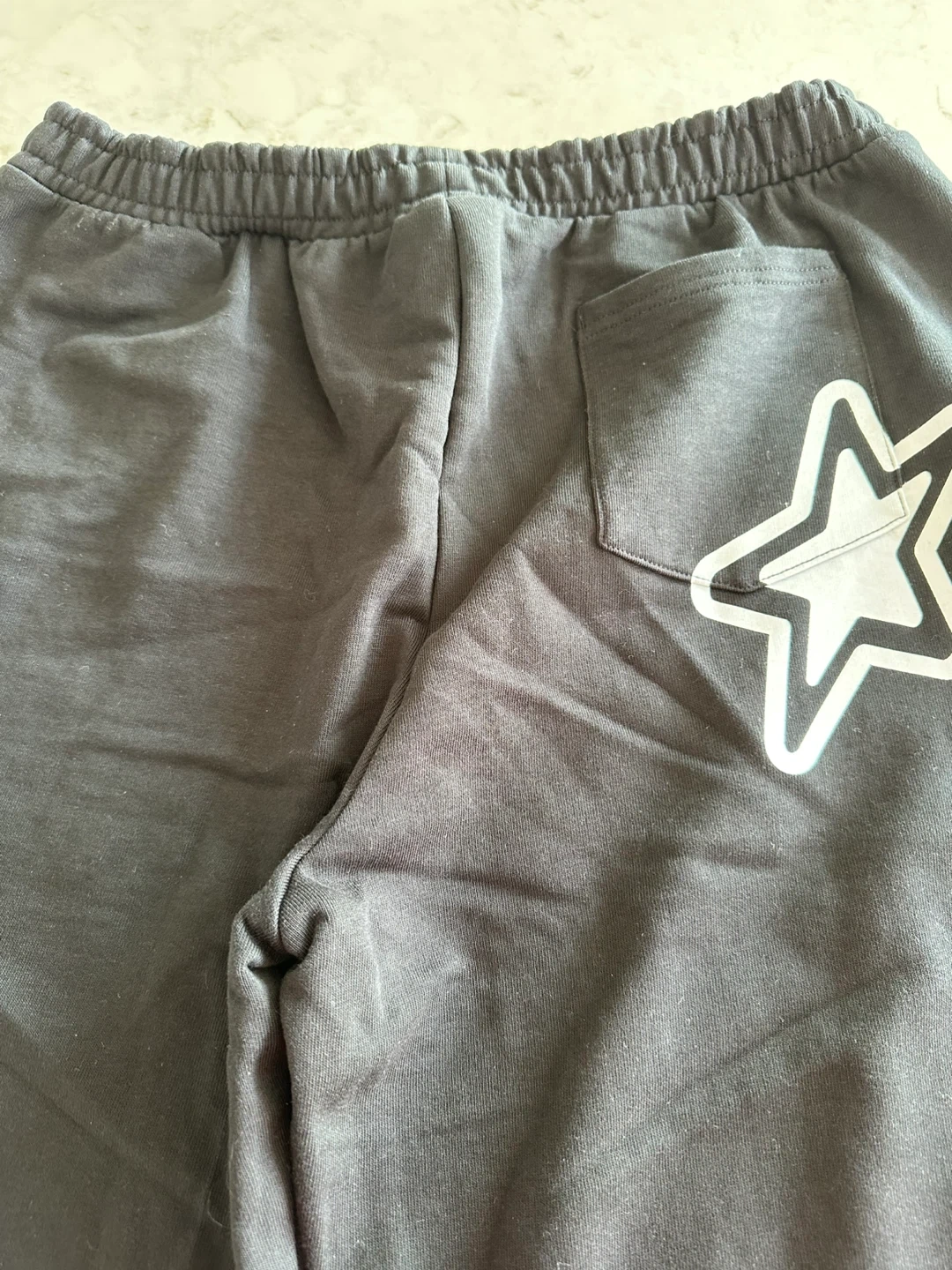 Selling a pair of Gymshark joggers in black. They are a size medium and in great condition. Features the Gymshark logo and 'BADDIE' printed on the side!