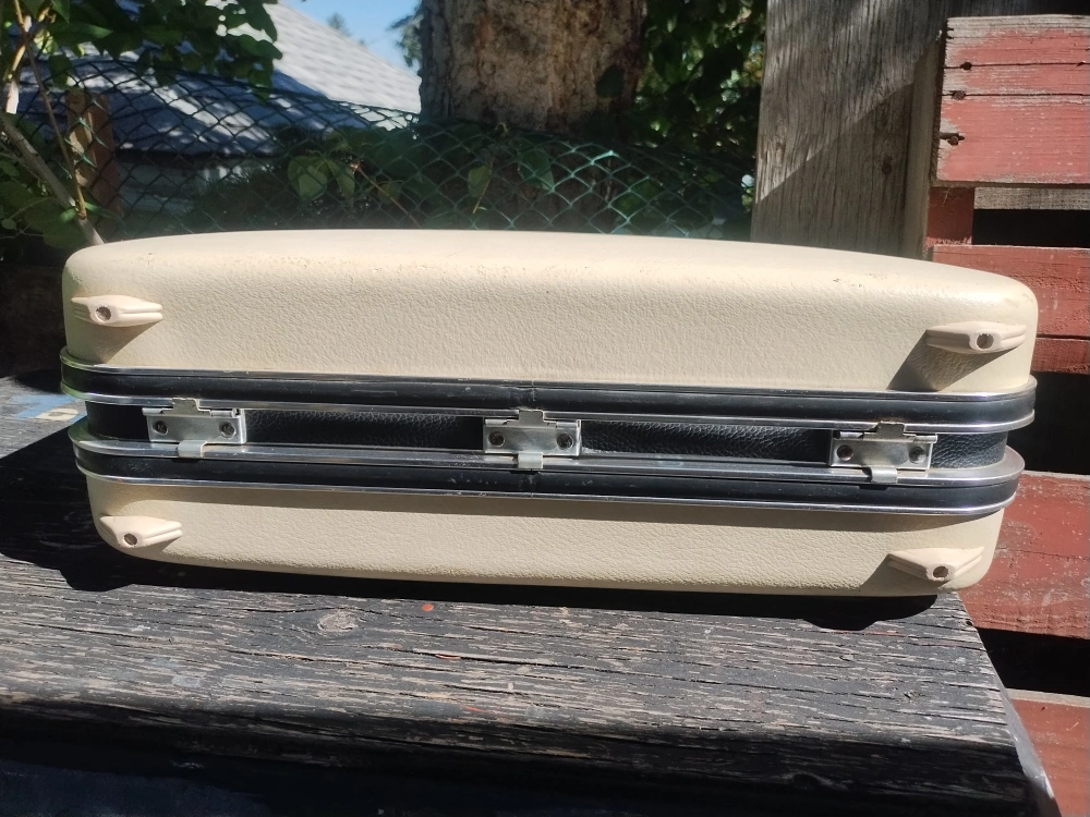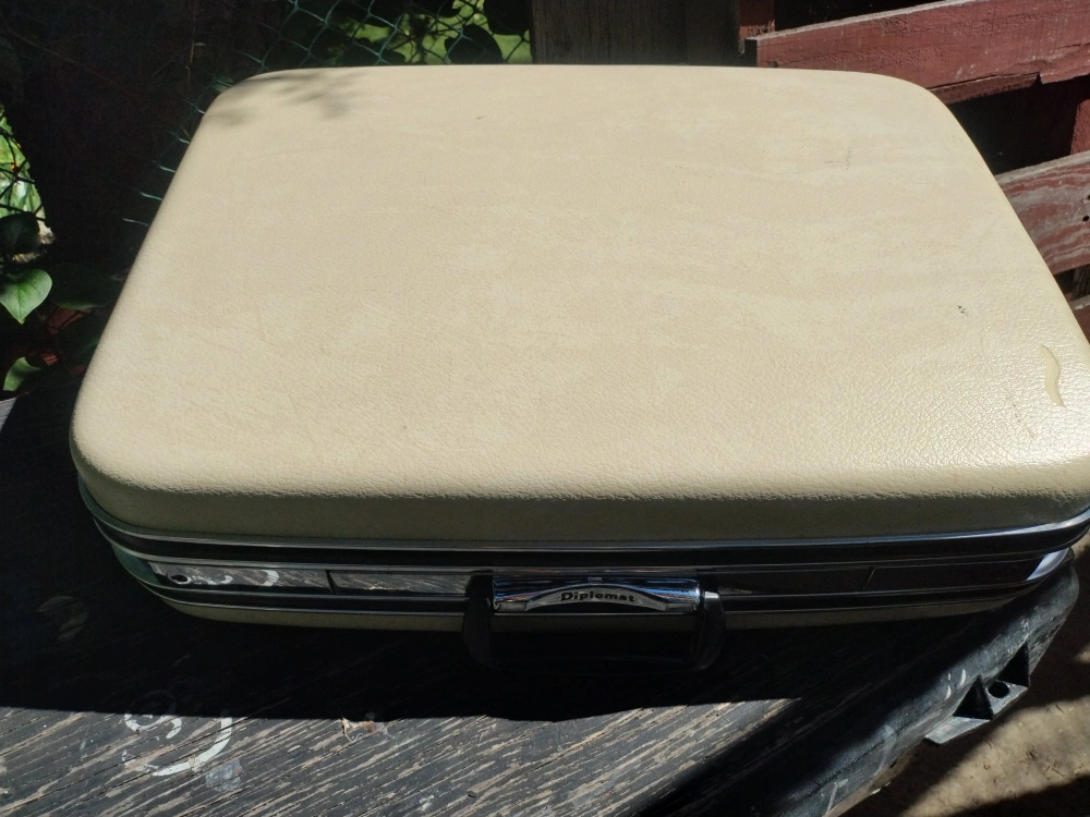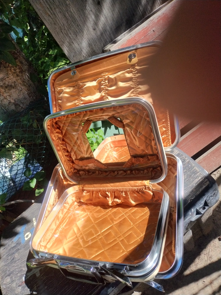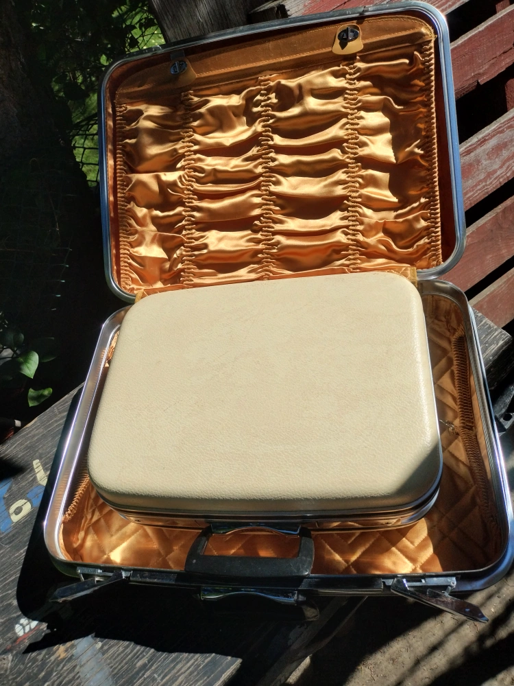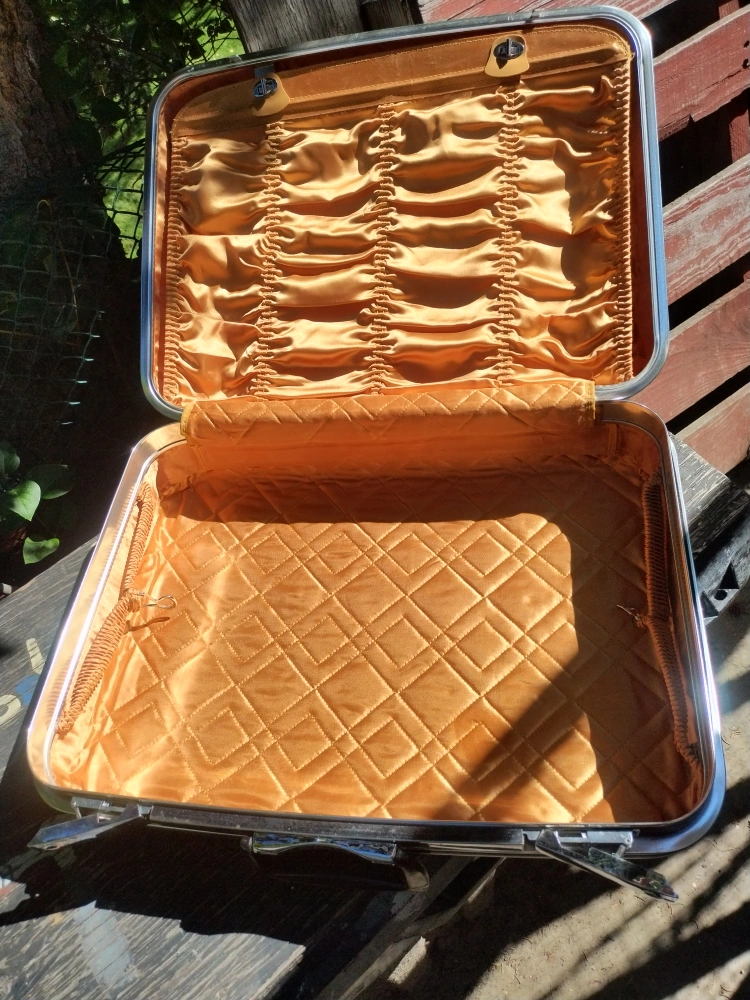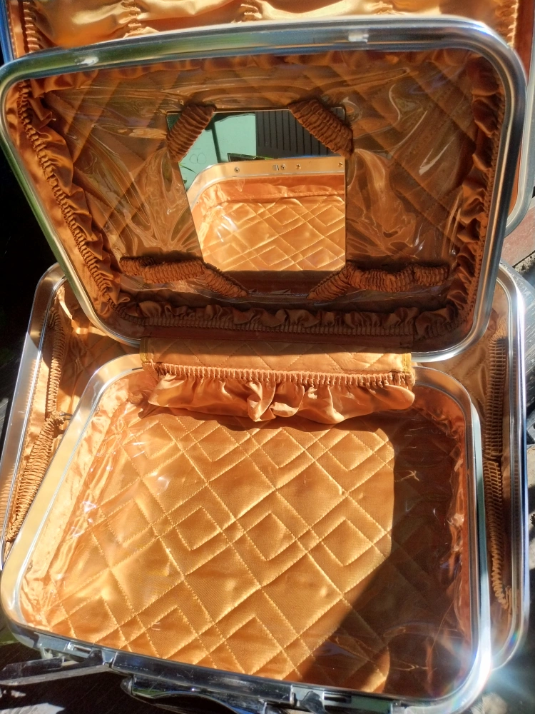 945Selling a vintage Diplomat suitcase set in very nice condition. The set includes a larger 21" suitcase and a smaller 16" fitted vanity case. Both are rigid, taper slightly narrower towards the top, and have pristine gold fabric lining.