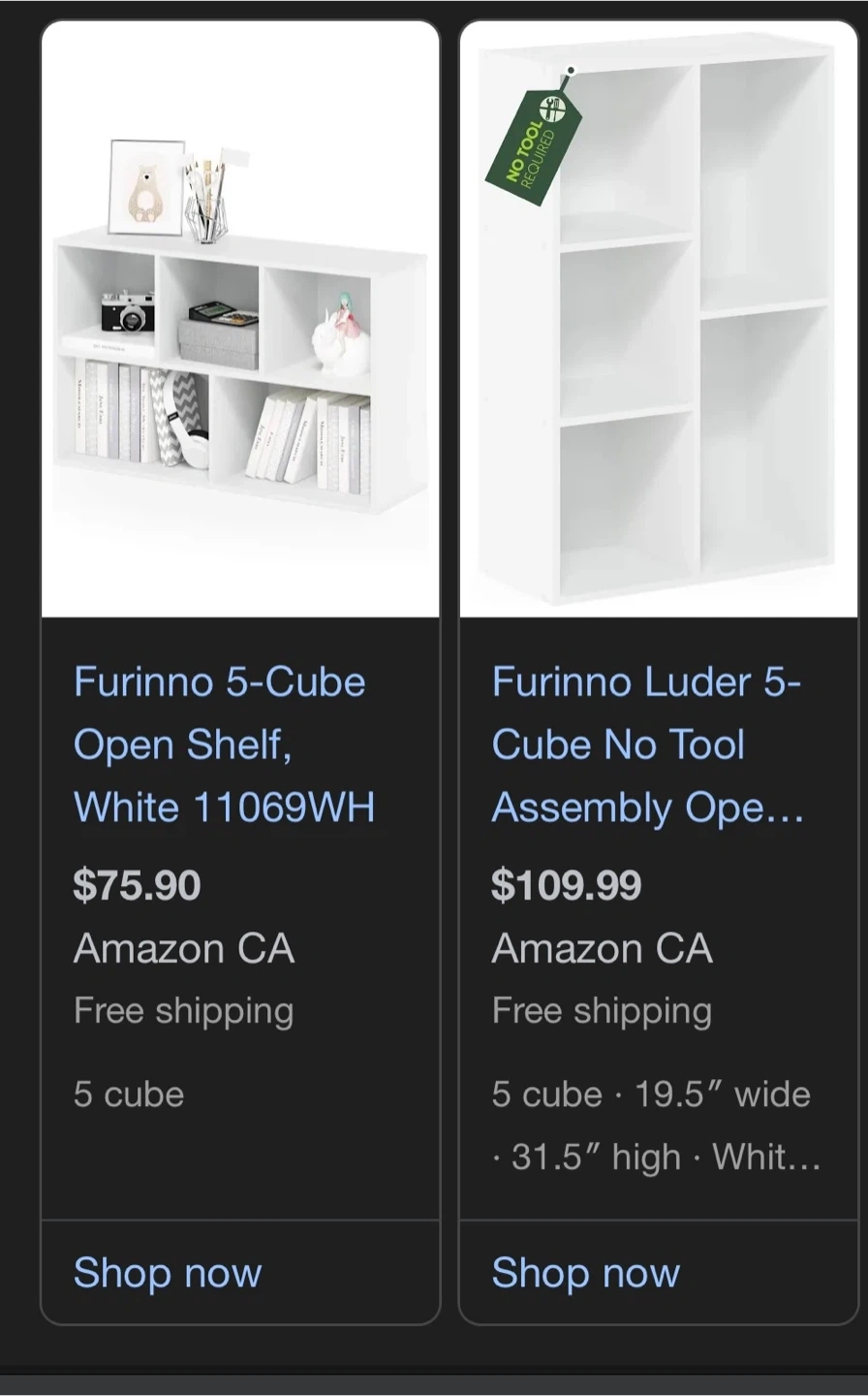 Selling a Furinno 5-Cube Open Shelf Bookcase in white! It's in great condition and comes in its original box, never opened. This is a great shelf for organizing books or displaying items. The dimensions are approximately 19.5" wide and 31.5" high. Easy to assemble with no tools required! Originally bought for $75.90. Bought two, decided to just use one.